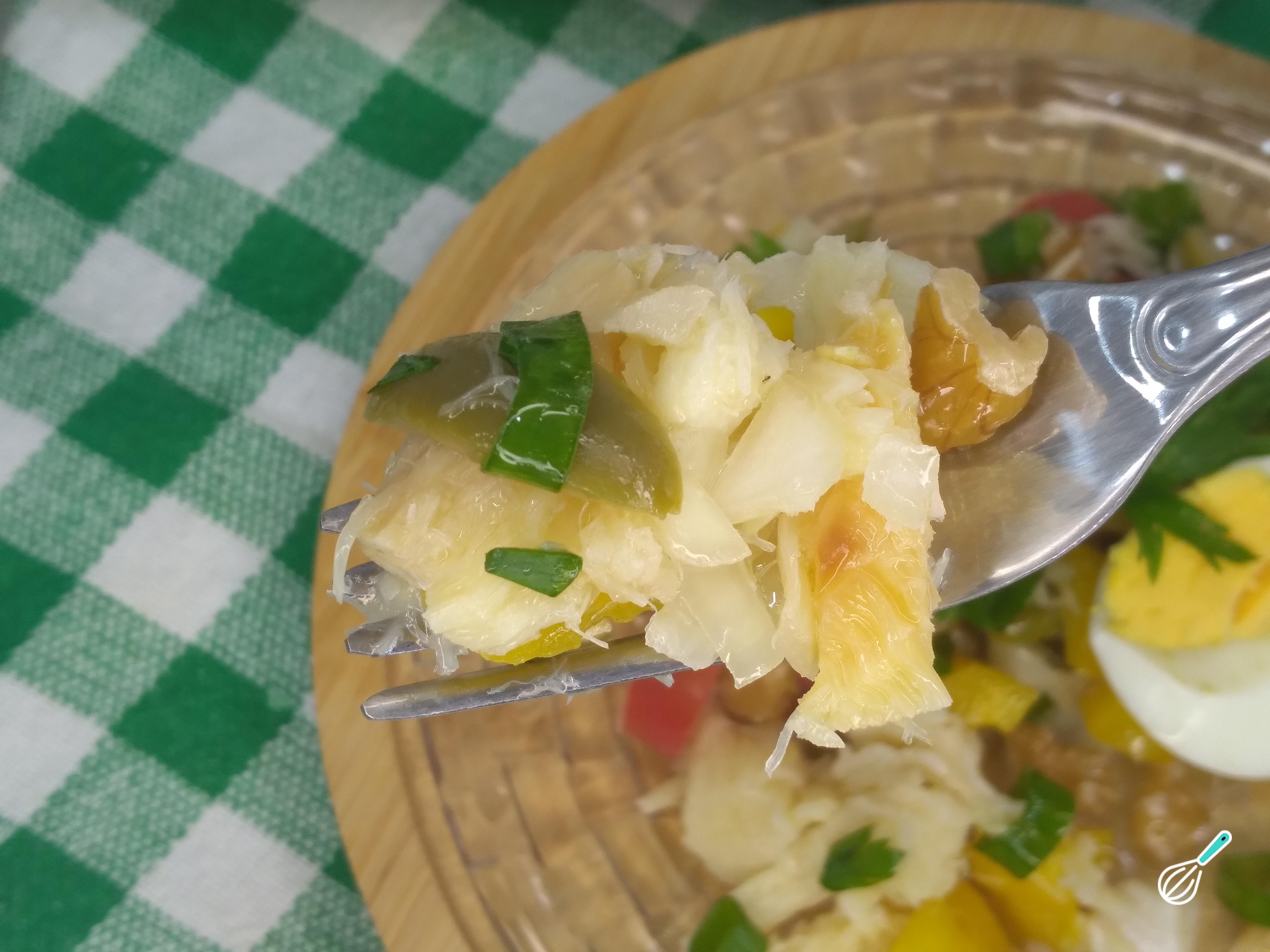 Depois de misturada, sua salada de bacalhau desfiado está pronta. Leve e muito saborosa, perfeita para uma entrada ou um acompanhamento. Faça e nos conte o que achou dessa receita.