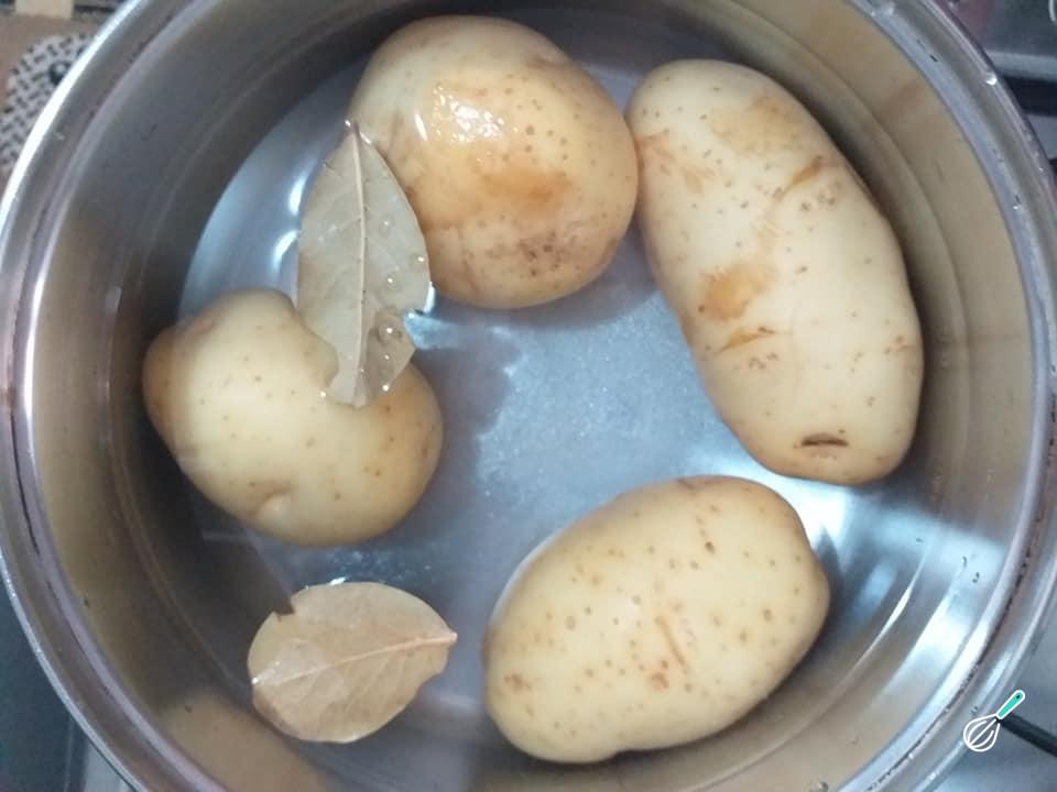 Cozinhe as batatas (com casca) com água, sal e folhas de louro por aproximadamente por 25 a 30 minutos.
