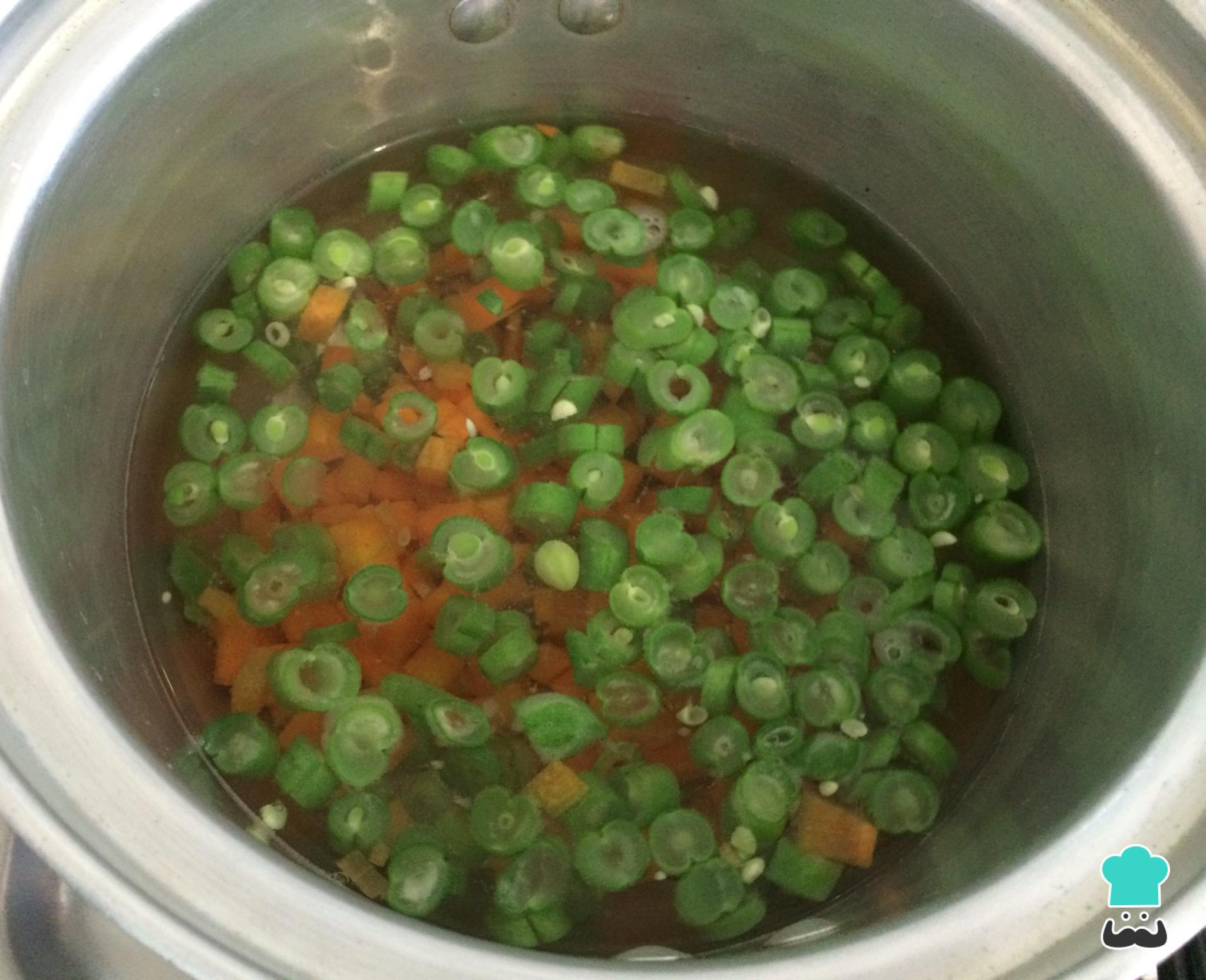 Noutra panela com água fervente e um pouco de sal, cozinhe durante 10 minutos a cenoura descascada e cortada em cubos e a vagem cortada em rodelas pequenas.