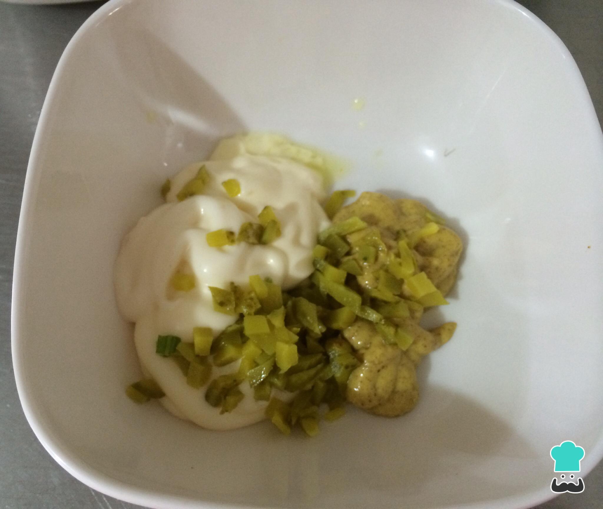 Para conferir mais sabor à salada de batata com aipo prepare um creme com a maionese, a mostarda e o picle cortado finamente.