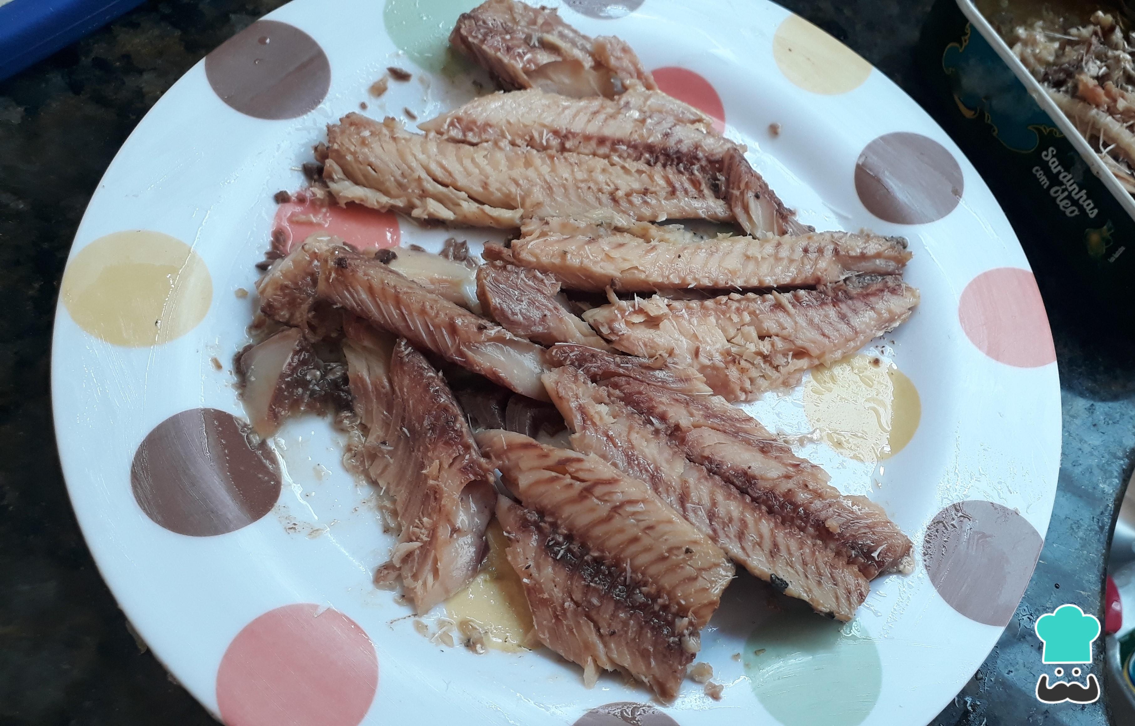Enquanto as batatas cozinham, limpe as sardinhas retirando a pele e as espinhas que estão no meio delas. Nesse momento você também poderá cortar os temperos, como a cebola e a cebolinha.