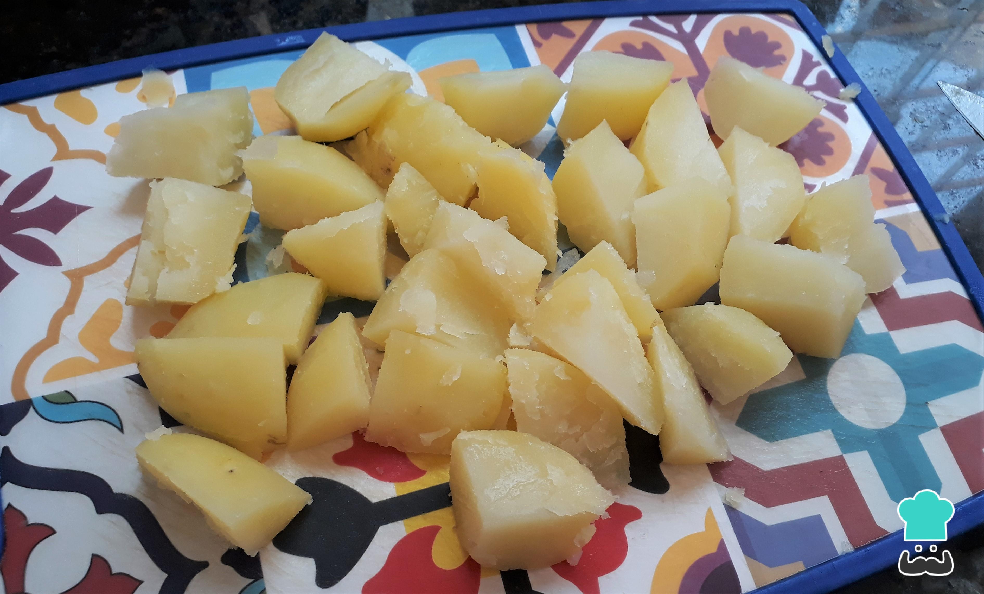 Espere as batatas esfriarem e corte-as em pedaços no tamanho que preferir. Eu cortei em pedaços médios.