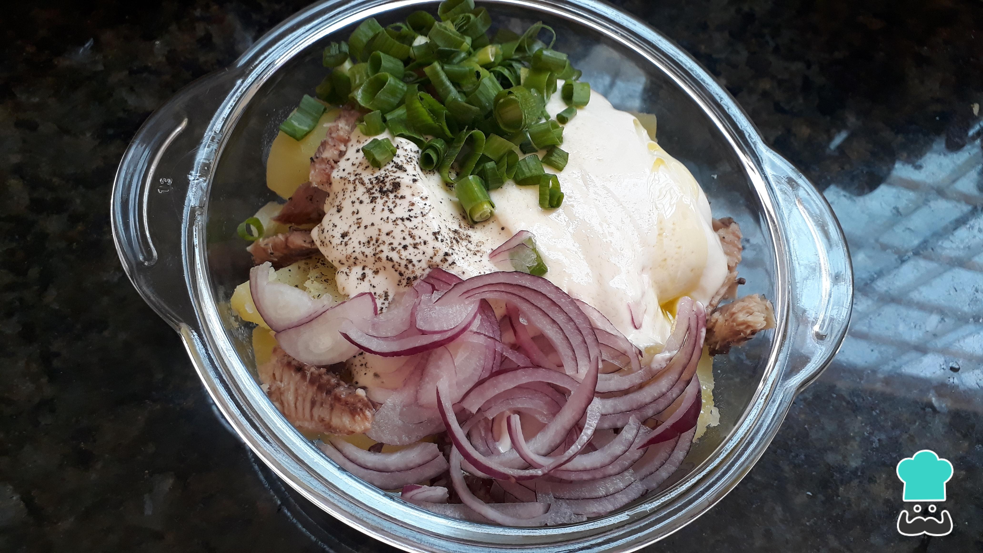 Em um recipiente junte todos os ingredientes: as batatas, a sardinha, a maionese e os temperos. Misture tudo muito bem.