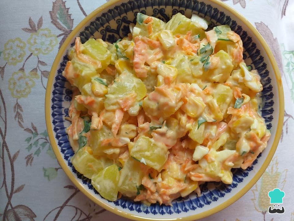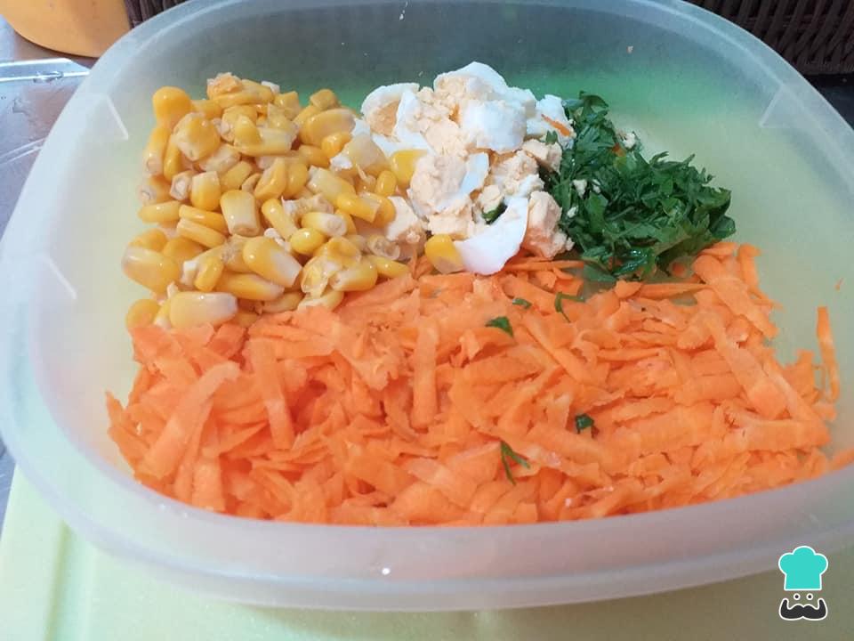 Numa tigela média, misture o milho, a cenoura, a salsa e os ovos já cozidos e picados.