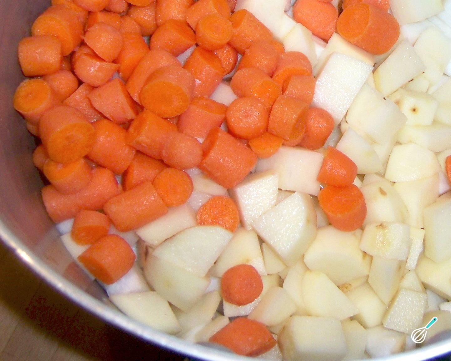 Descasque as batatas e as cenouras, corte em pedaços com mais ou menos o mesmo tamanho e coloque numa panela. Cubra com água, adicione um pouco de sal e deixe ferver no fogo médio até que estejam macias.