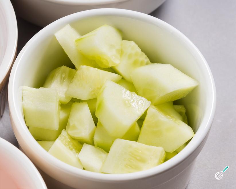 Descasque o pepino, corte em pedaços do mesmo tamanho que as batatas e cenouras. Faça isso também com os picles. Coloque todos esses legumes numa tigela, misture e reserve.