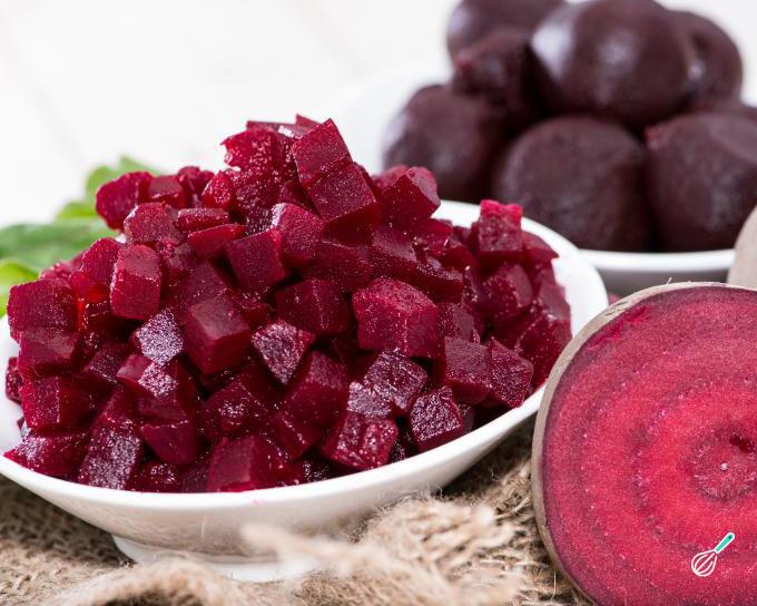 Em um recipiente misture a beterraba cozida e os cubos de maçã.
