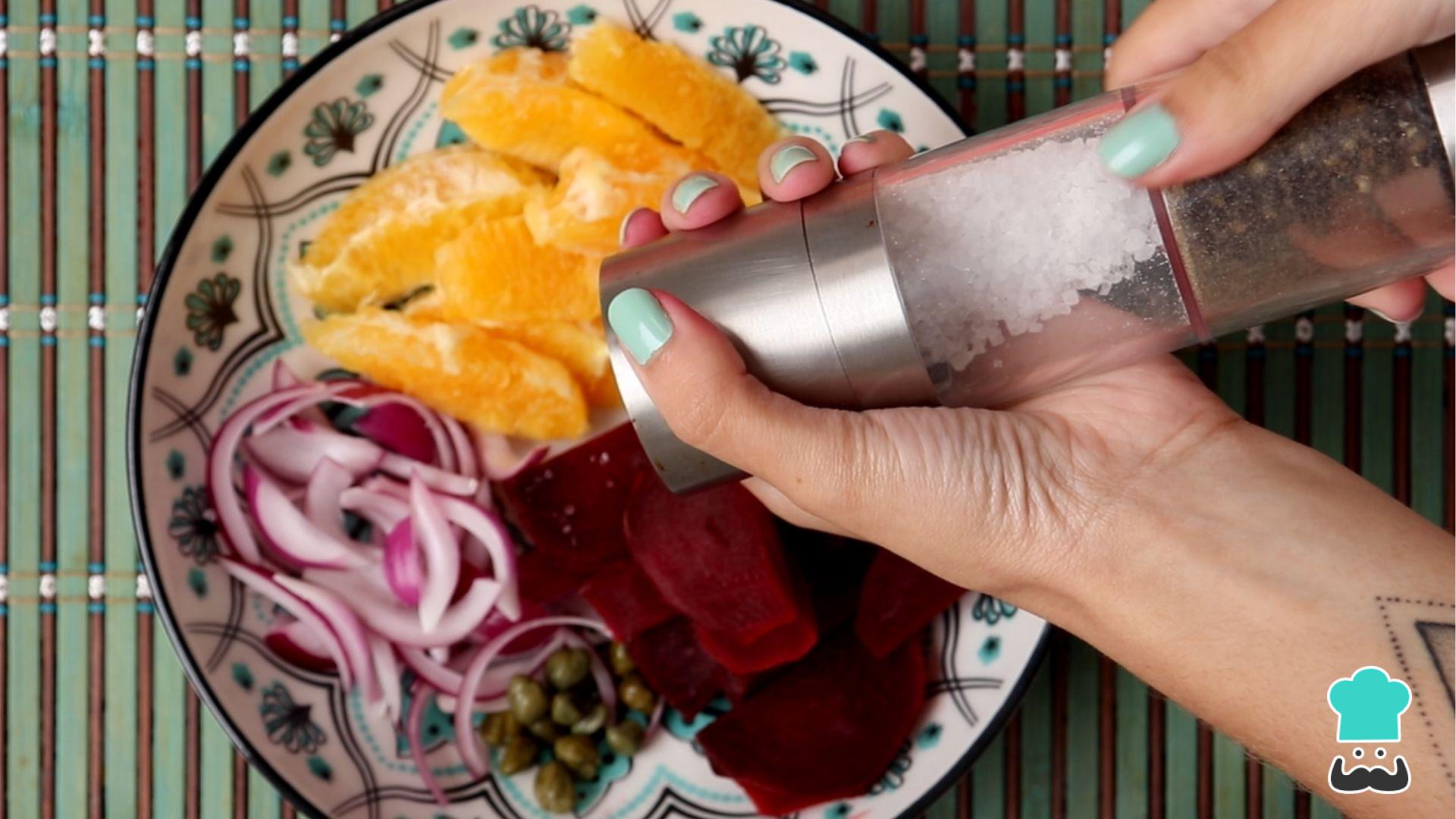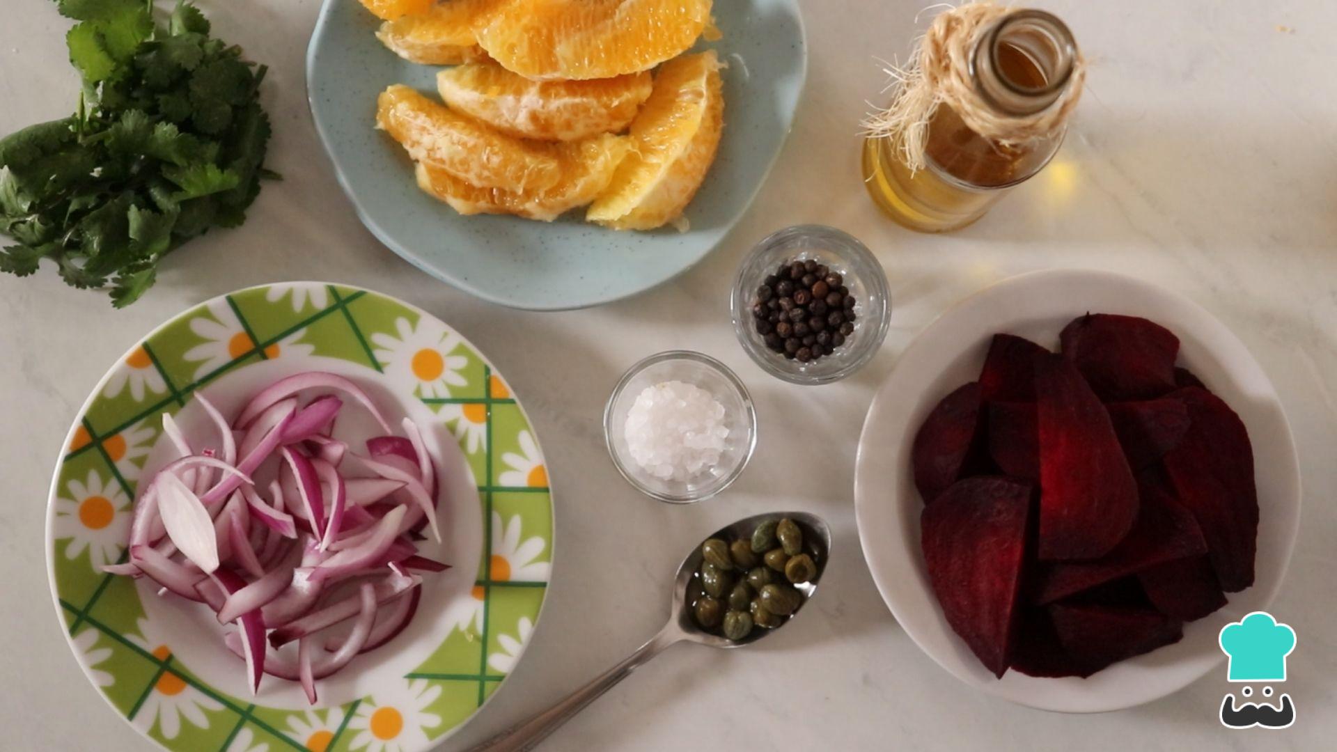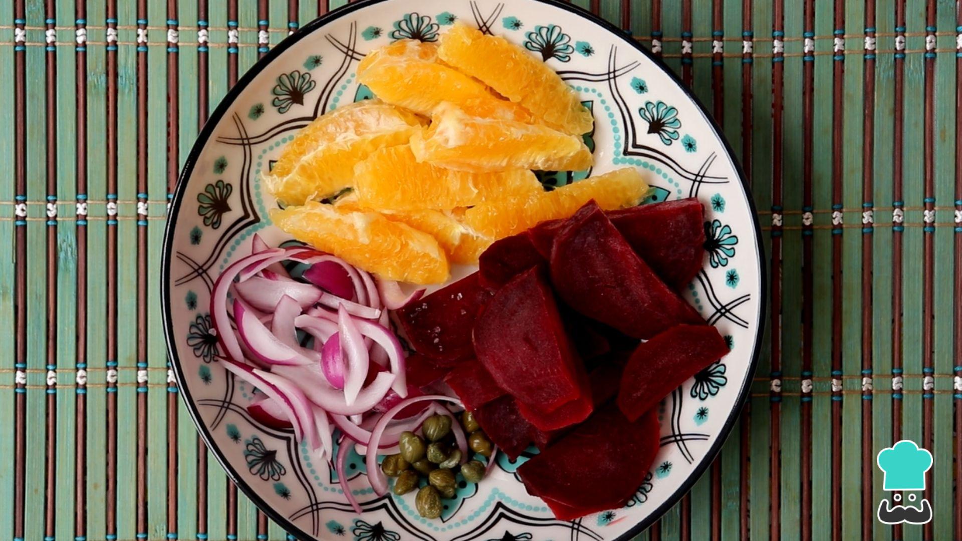 Após o passo anterior, em um prato ou tigela coloque a laranja, as alcaparras, a cebola e a beterraba.