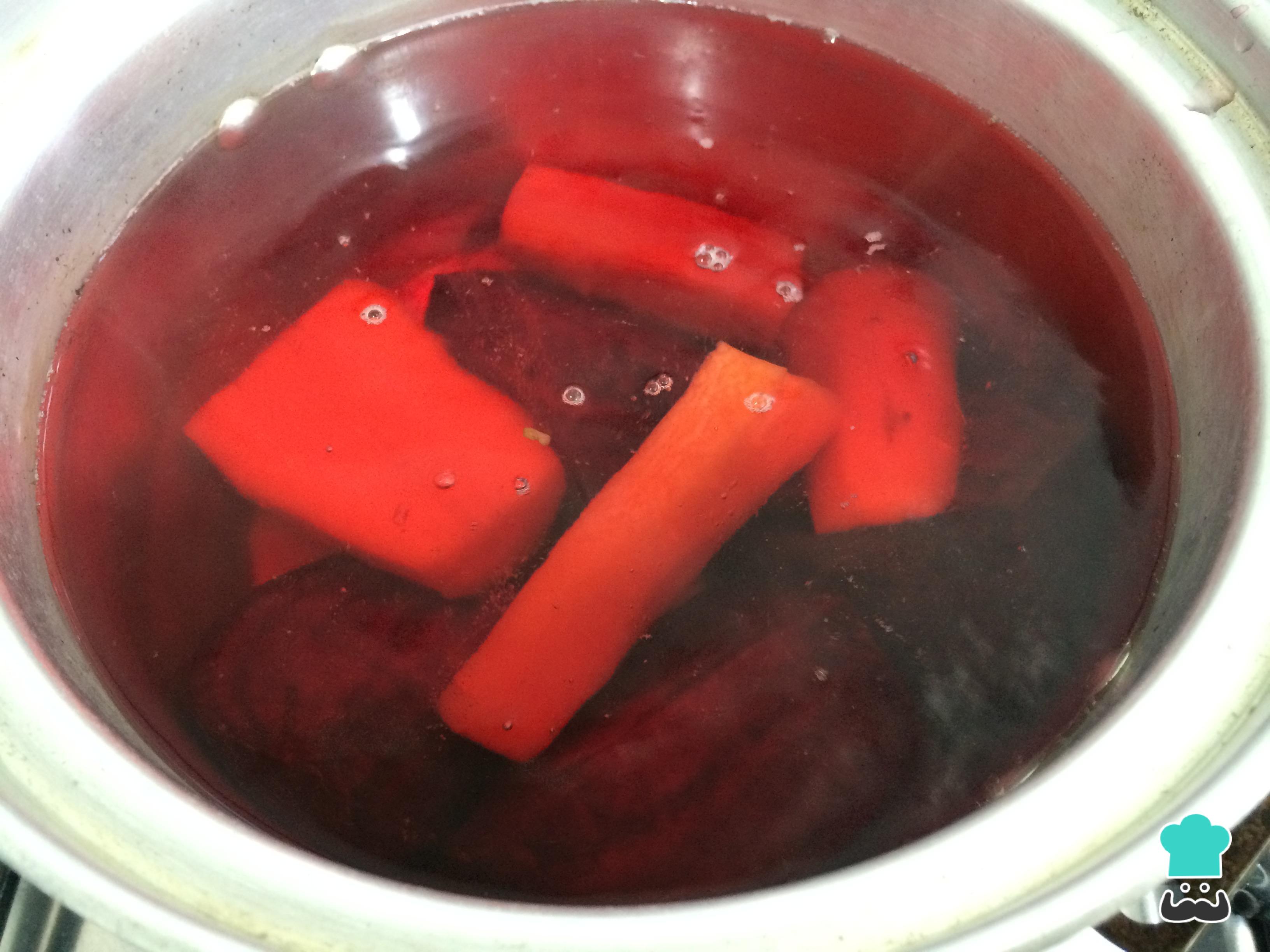 Em uma panela com água cozinhe a beterraba e a cenoura, ambas sem pele e cortadas em pedaços grandes, por 25 minutos, ou até que fiquem macias.