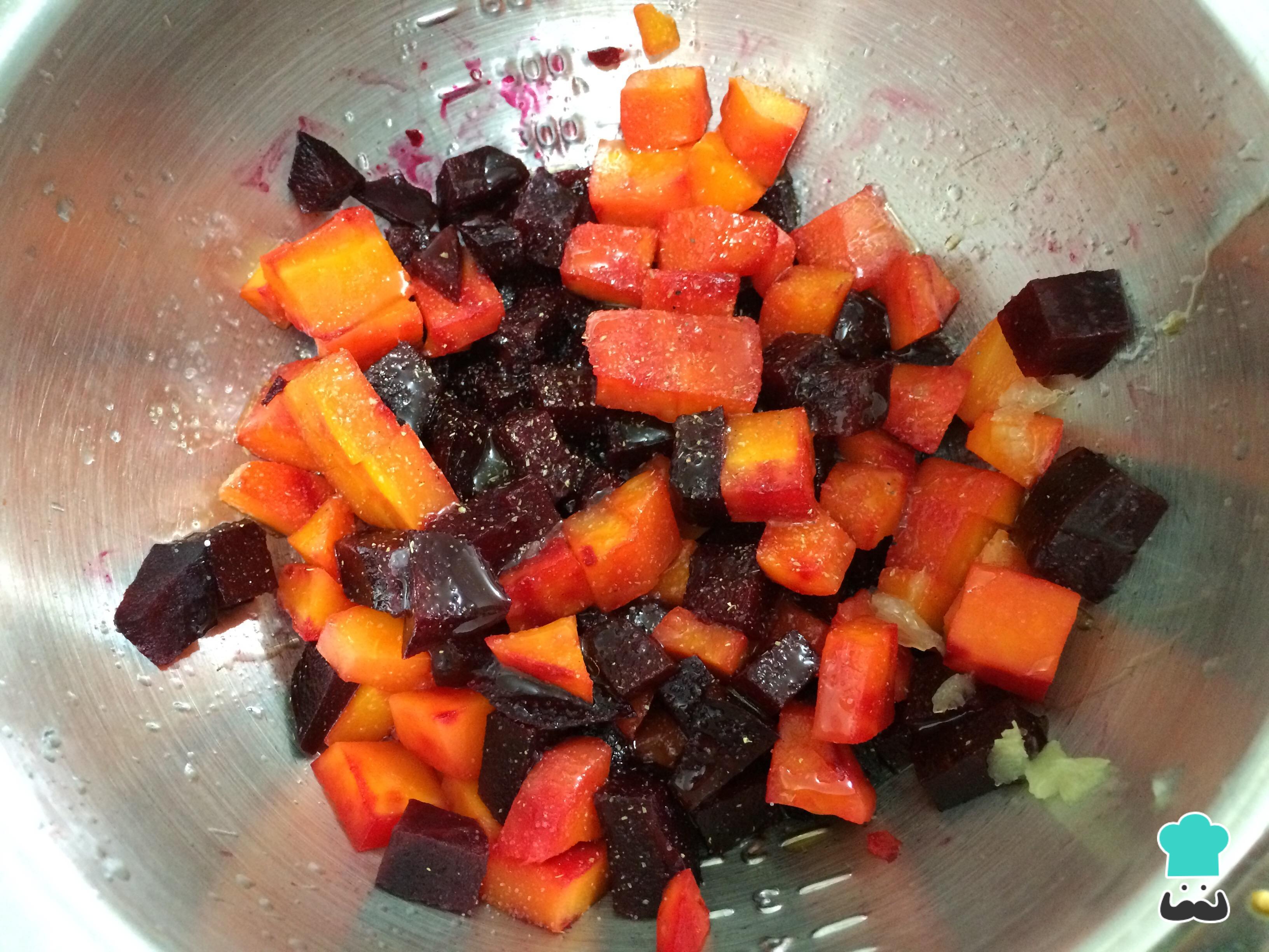 Quando os legumes estiverem macios, corte-os em pedaços menores e tempere com azeite de oliva, suco de limão, sal e pimenta.