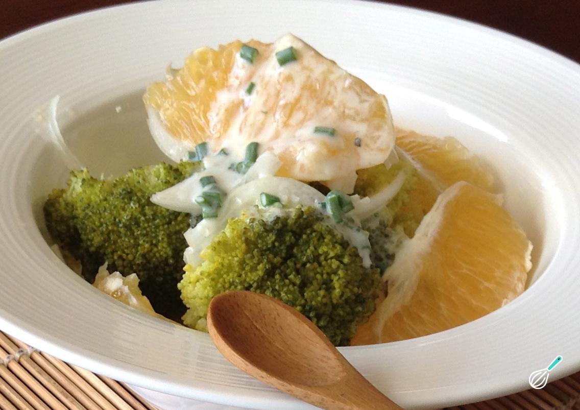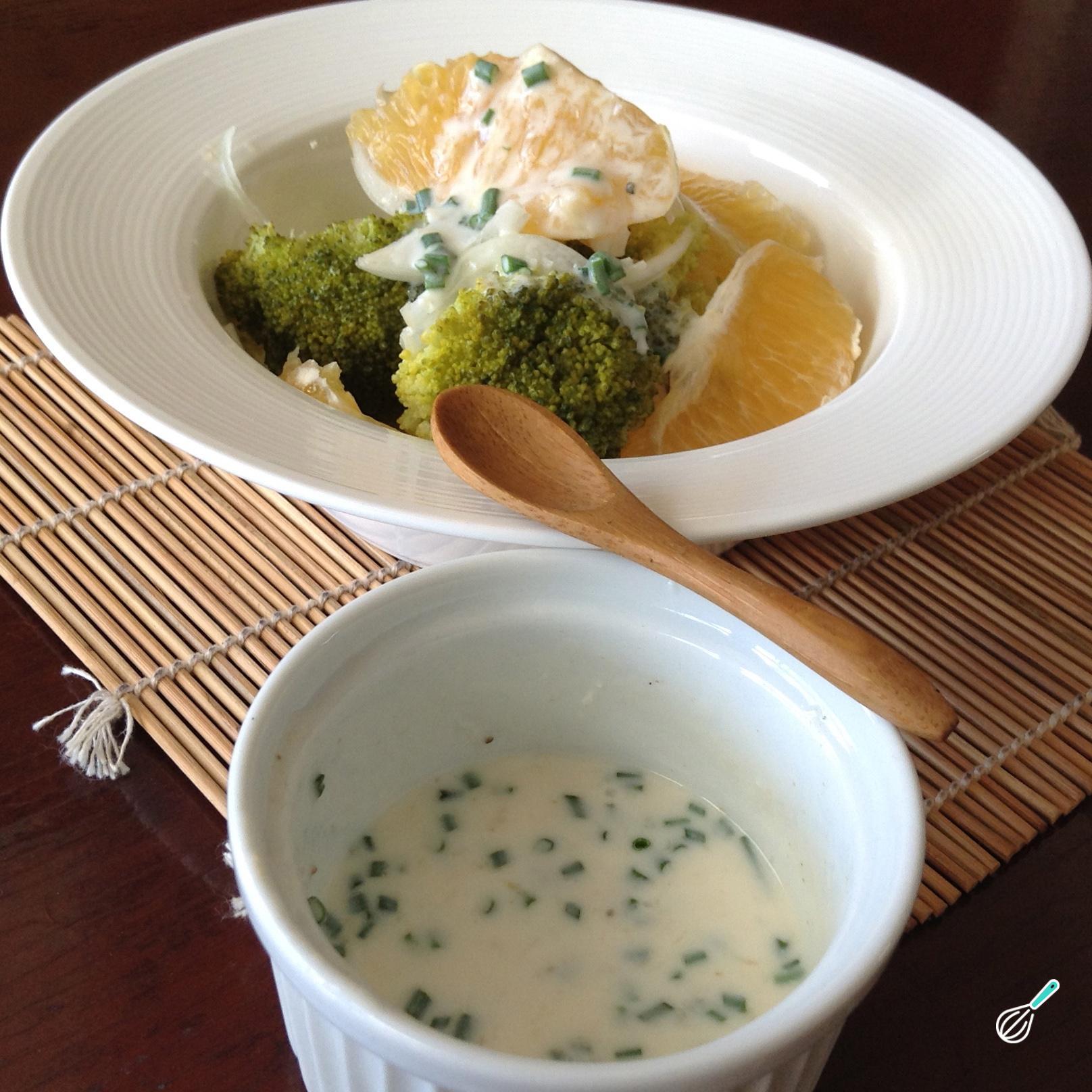 Regue a salada de brócolis e laranja com um pouco do molho, e está pronta a servir! Aproveite esta receita de salada de brócolis ao molho de iogurte, perfeita para os amantes de refeições saudáveis e baixas em calorias. Bom apetite!