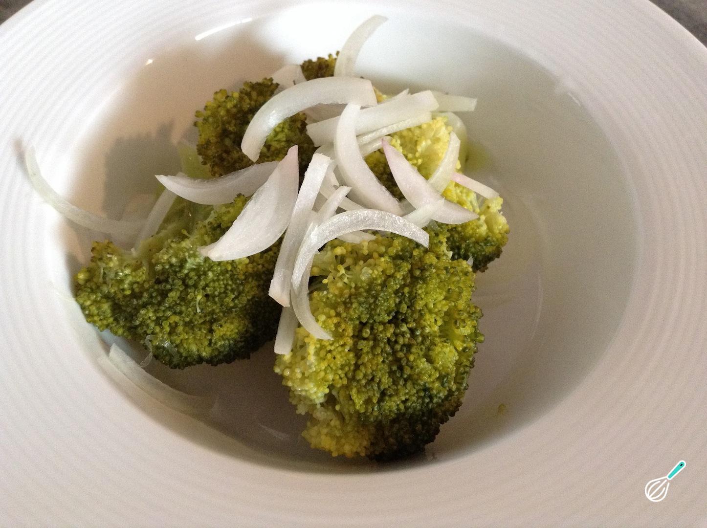 Coloque as árvores de brócolis cozinhadas e a cebola branca cortada em pétalas no prato onde vai servir a salada.