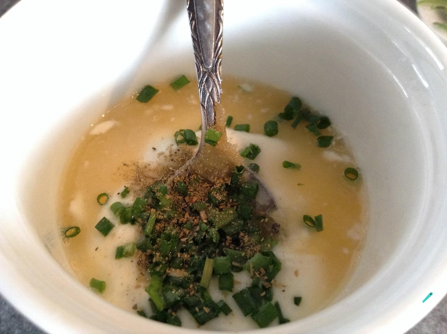 Para fazer o molho de iogurte, numa tigela adicione o iogurte grego, o suco de laranja, a cebolinha, sal, pimenta do reino e pasta de alho a gosto. Misture bem os ingredientes e, se você quiser, também pode adicionar algumas especiarias que goste mais.