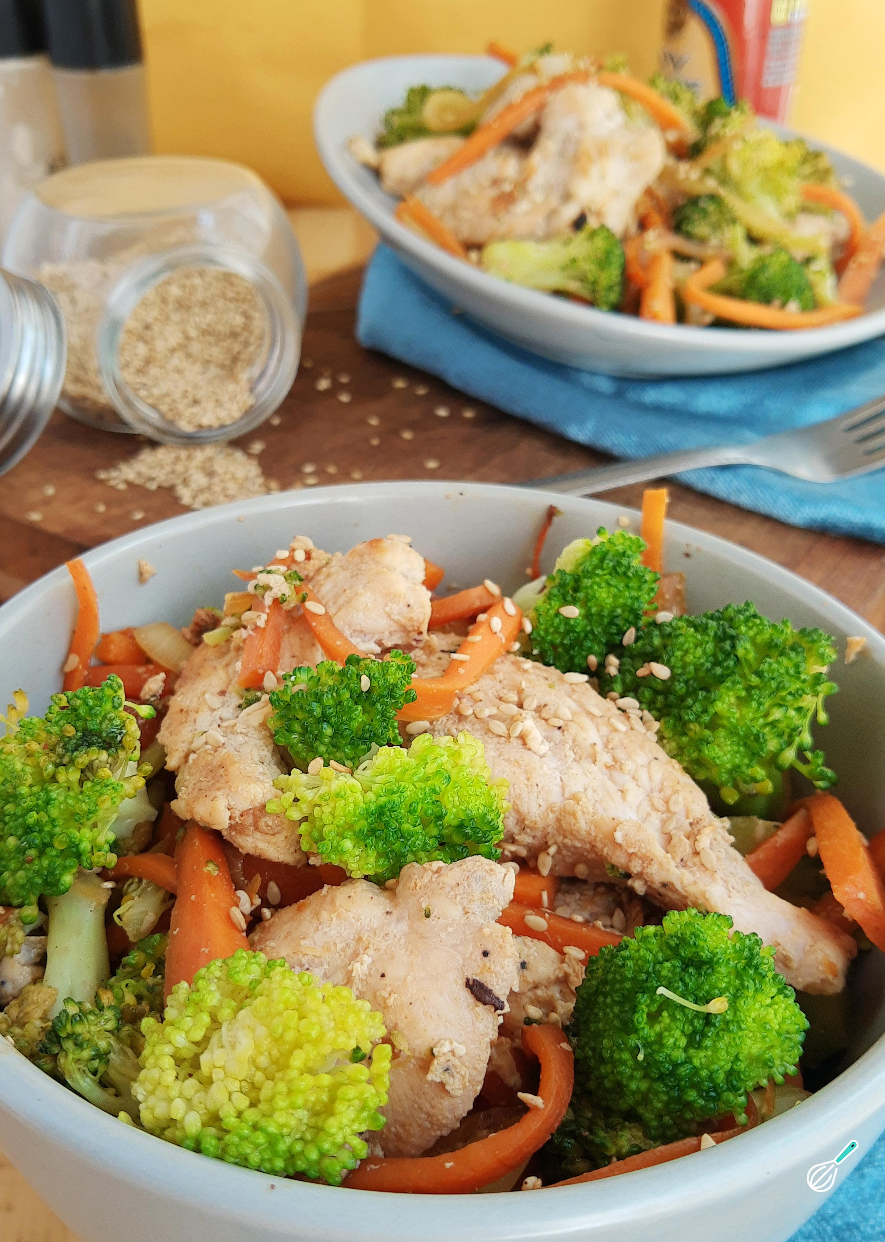 Volte com o frango para a panela, polvilhe o gergelim e misture.