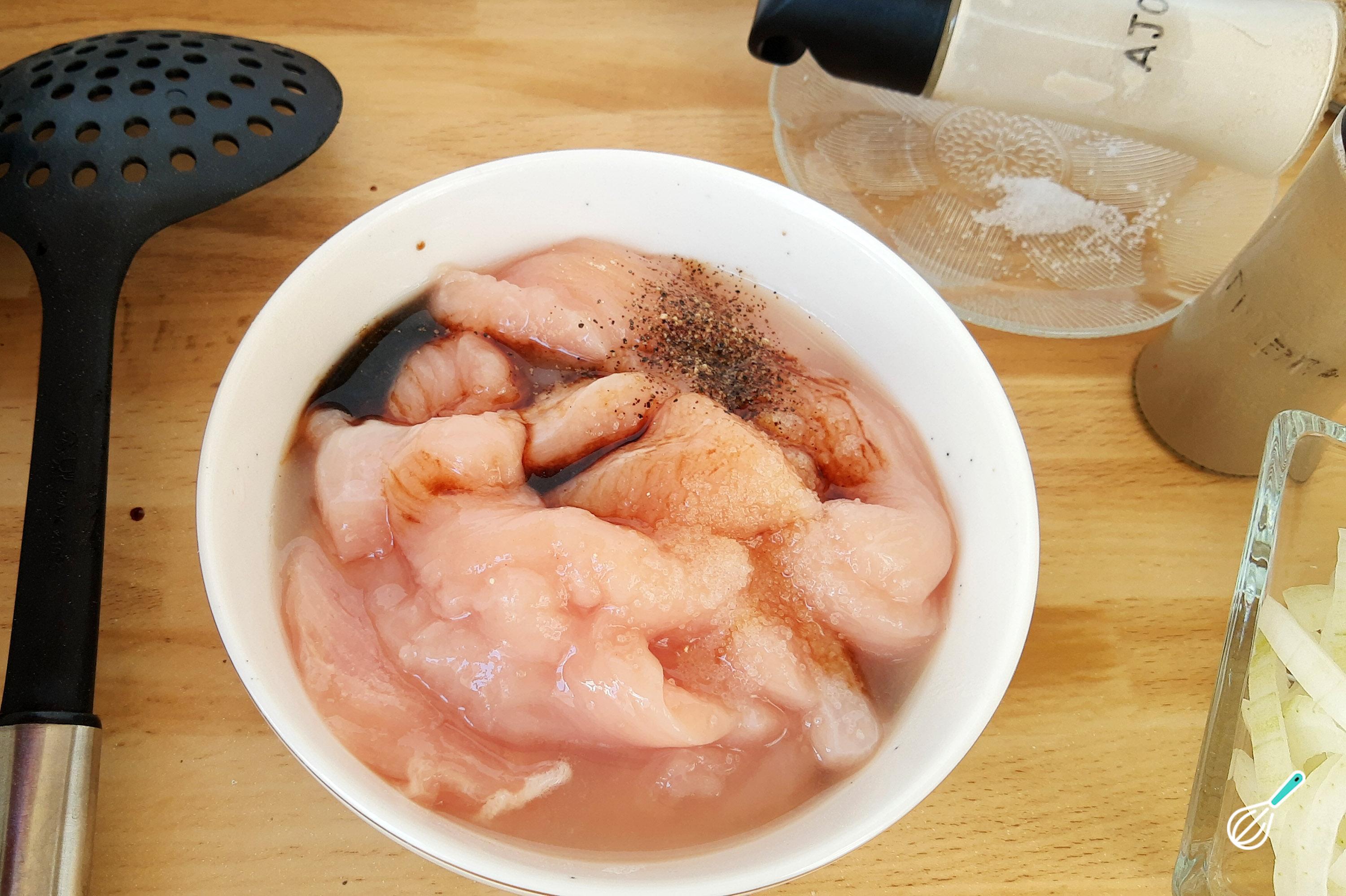 Como primeiro passo para fazer esta receita saudável com frango e brócolis é cortar o peito de frango em tiras ou cubinhos. Para temperar o frango coloque-o numa tigela com um pouco de sal, pimenta, alho moído e o shoyu. Misture e reserve por, no mínimo, 20-30 minutos.