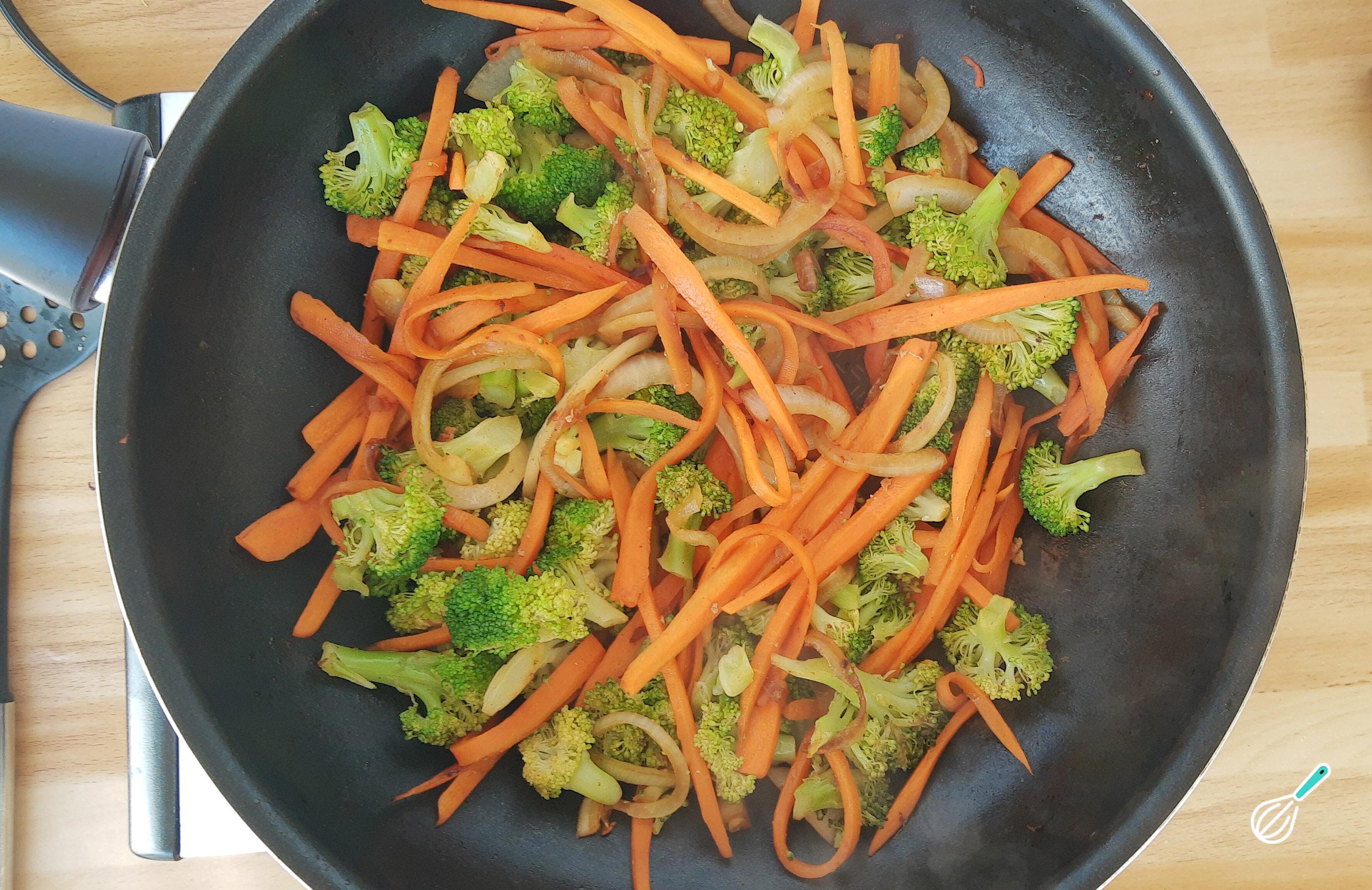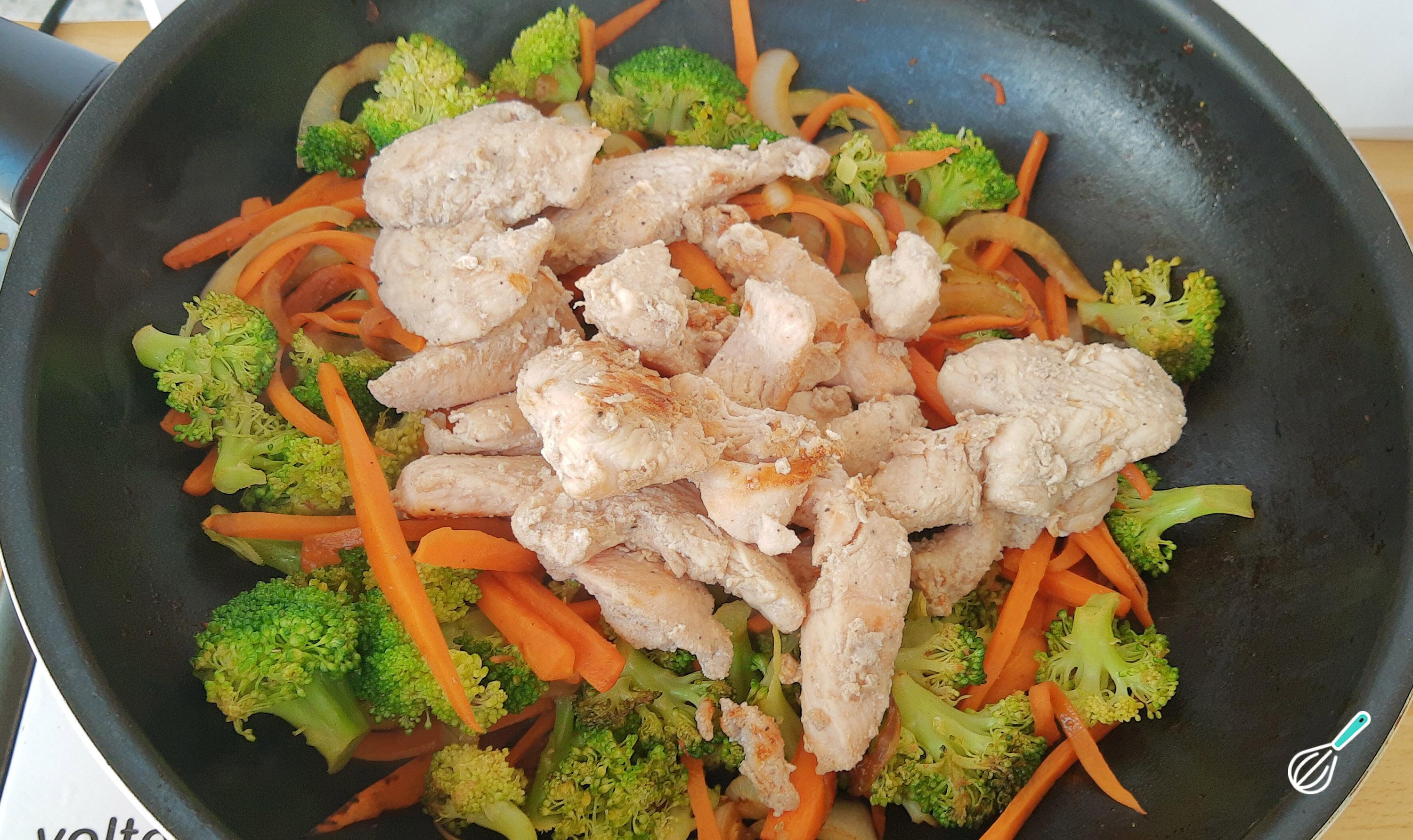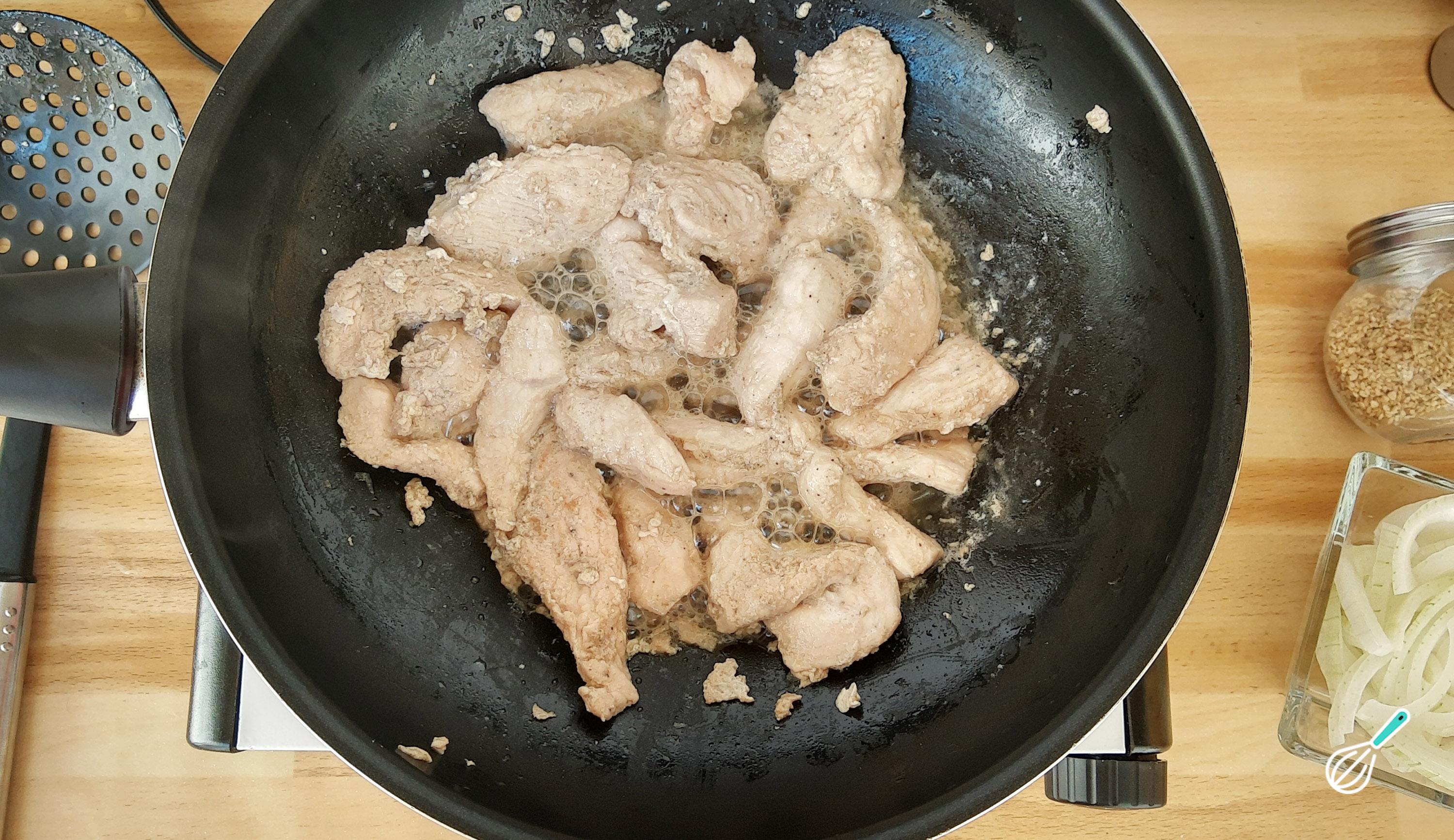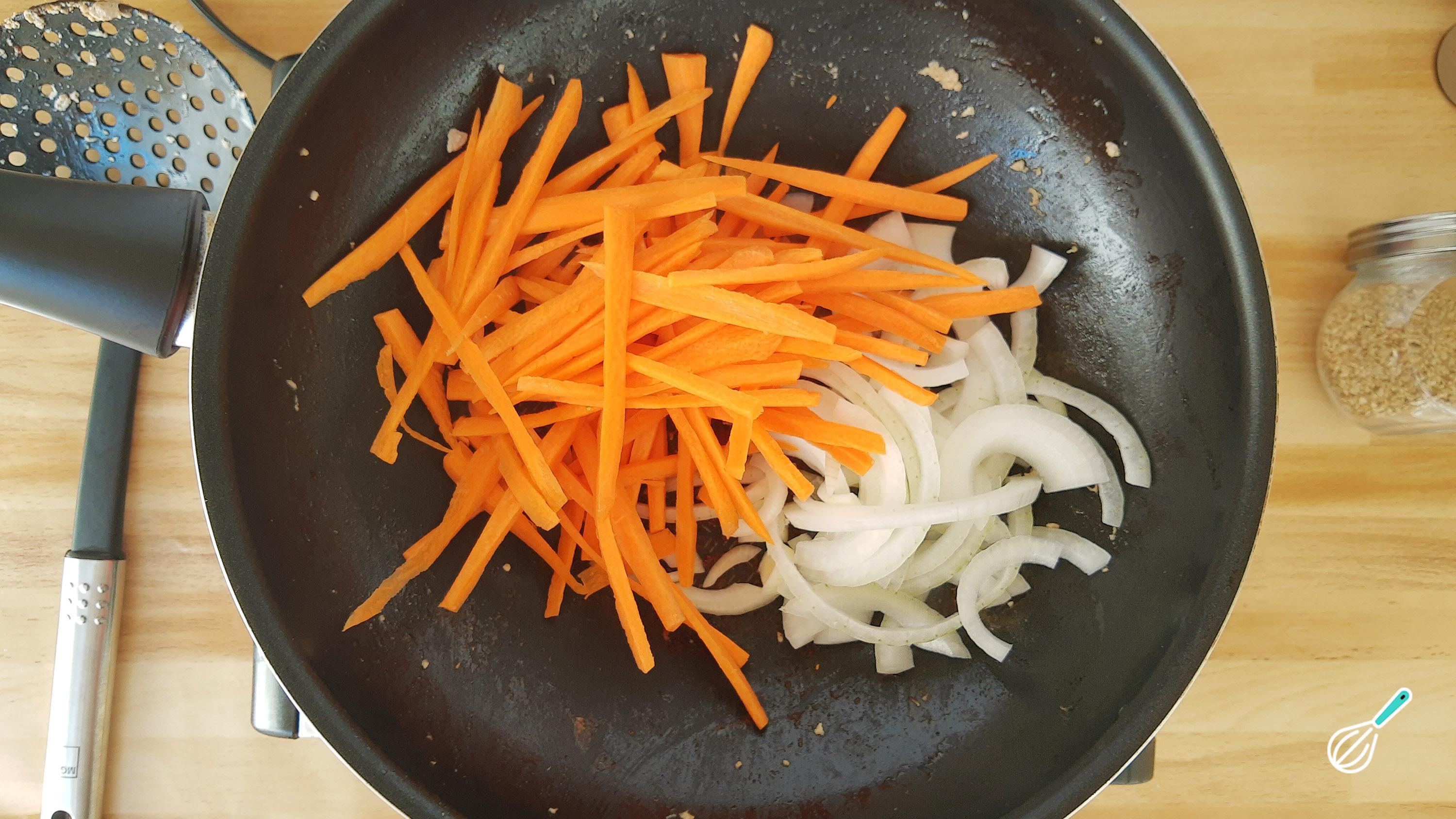 Na mesma panela ou frigideira onde cozinhou o frango, adicione a cebola fatiada e a cenoura em palitos. Cozinhe no fogo médio-baixo até a cebola ficar transparente e a cenoura amolecer - isto demorará cerca de 8 a 10 minutos. Mexa de vez em quando para evitar queimar.