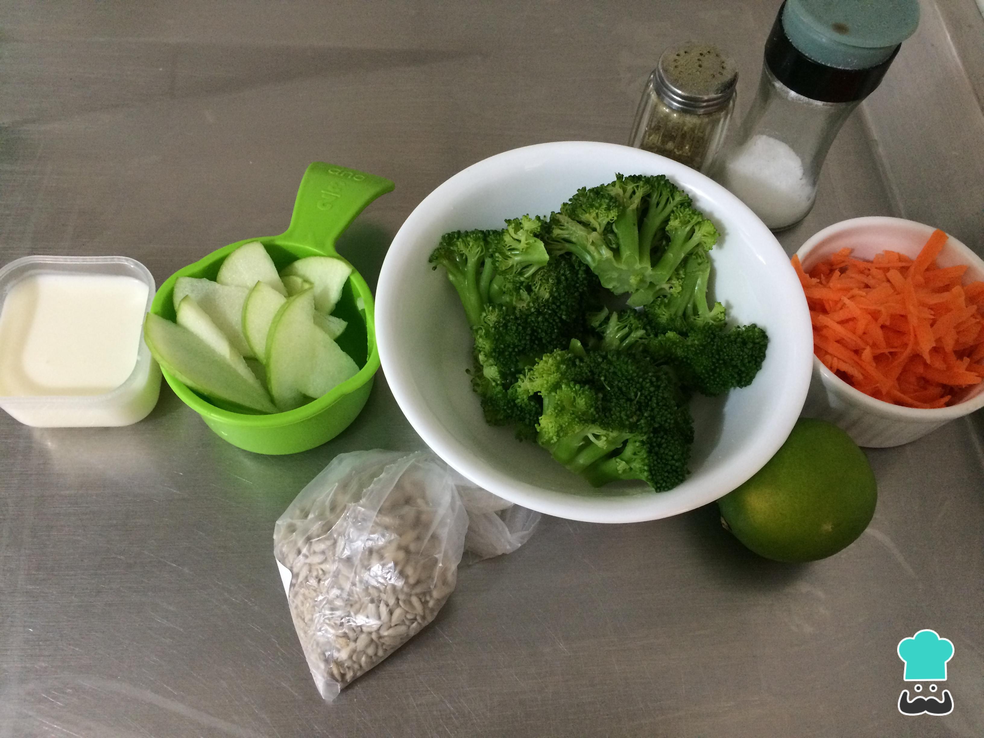 Depois de cozer o brócolis deixe que esfriem um pouco e coloque em uma tigela com a cenoura e a maçã.