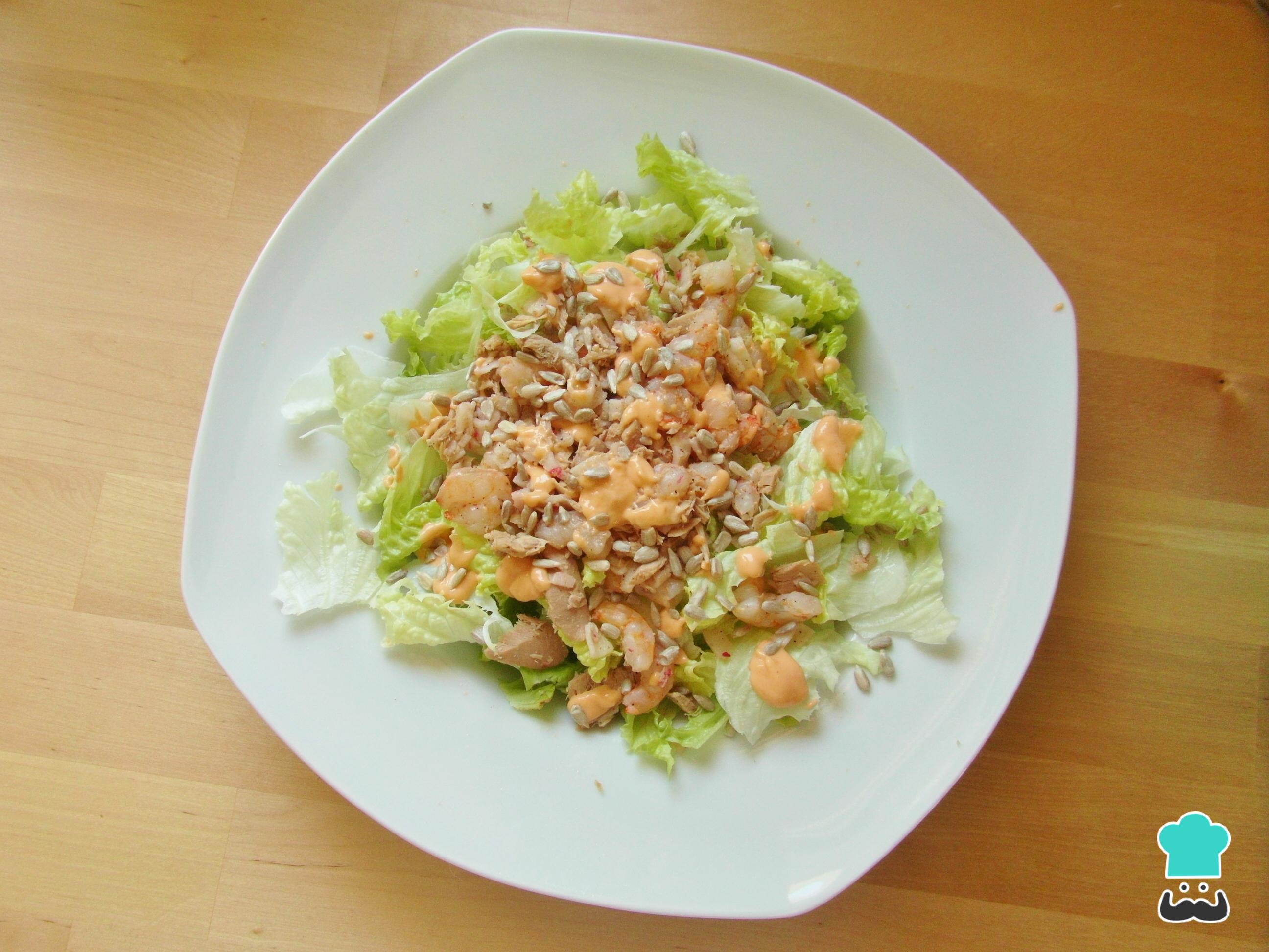 Coloque a alface nos pratos e, sobre ela, o abacate descascado e cortado em pedaços e o preparado anterior. Polvilhe sementes de girassol e, se quiser, adicione um pouco de molho rosa. Desfrute da sua salada de camarão e atum!