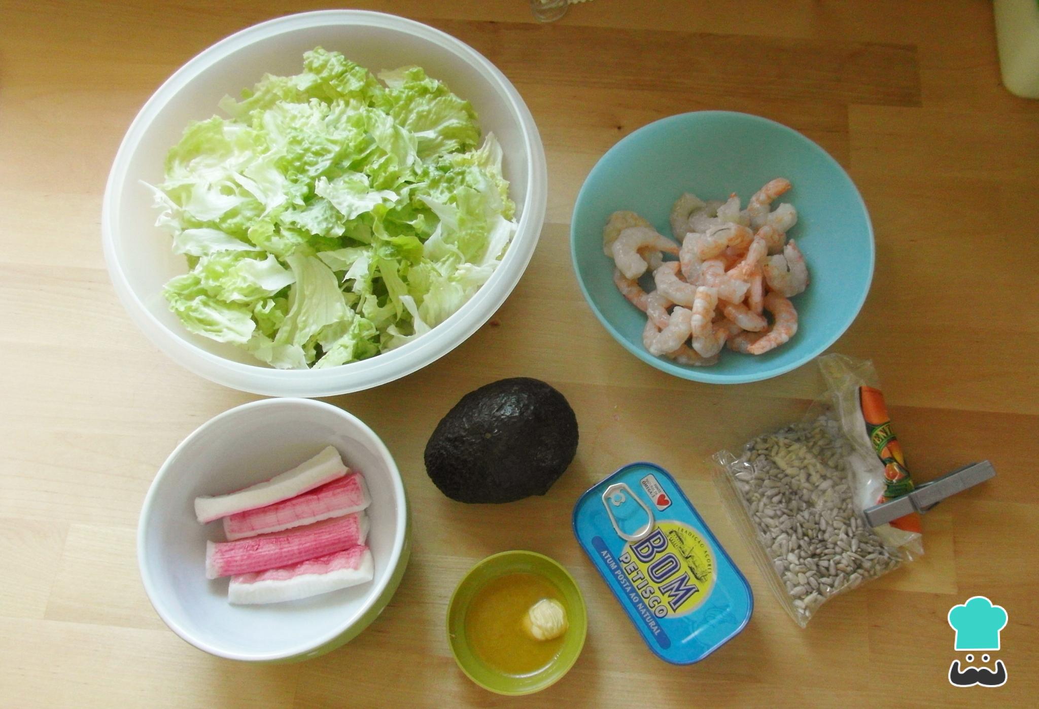 O primeiro passo desta receita de salada de camarão e atum é preparar os ingredientes.