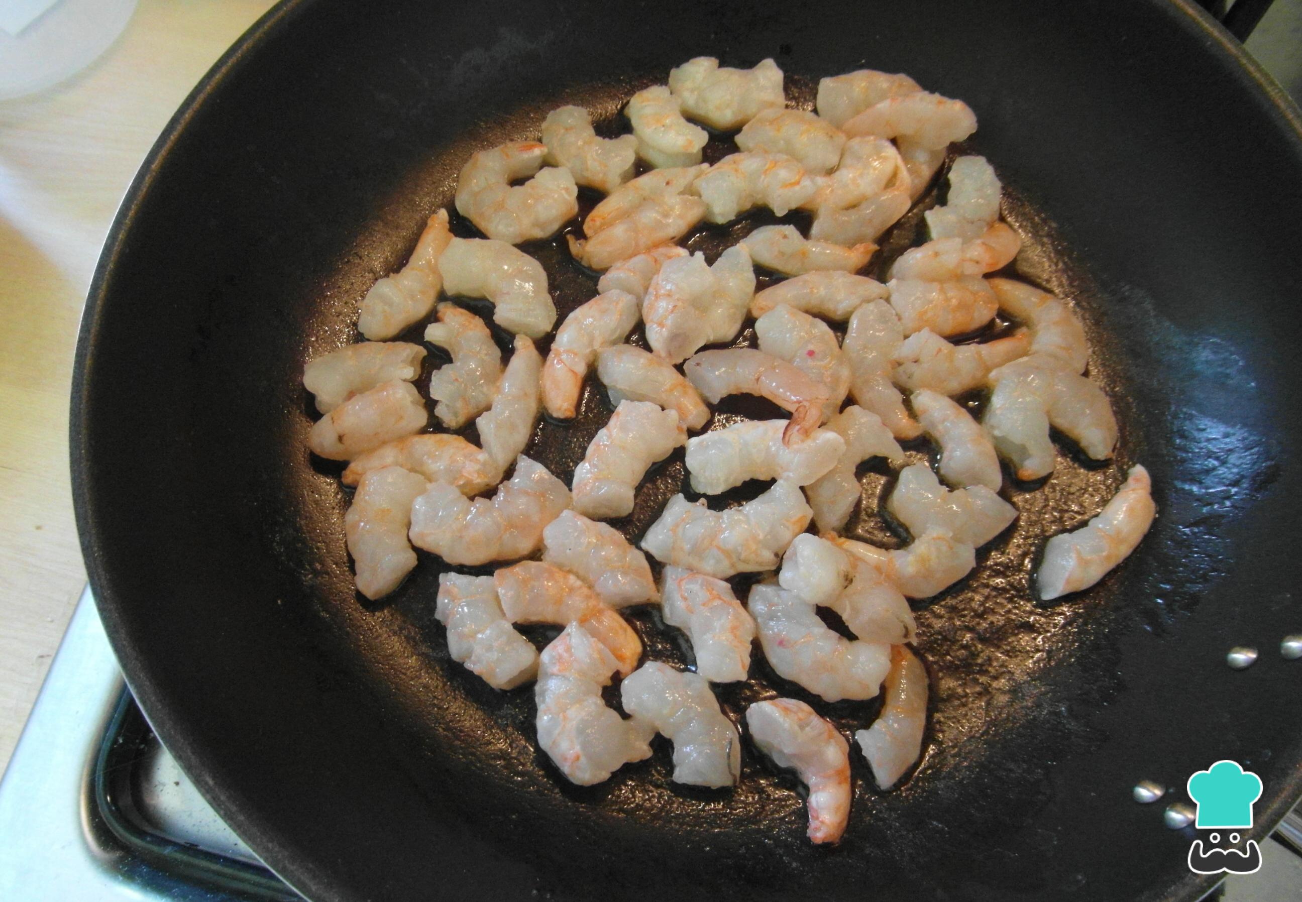 Numa frigideira ao fogo médio com a manteiga refogue os camarões, inteiros ou cortados em metades, até ficarem cozinhados.