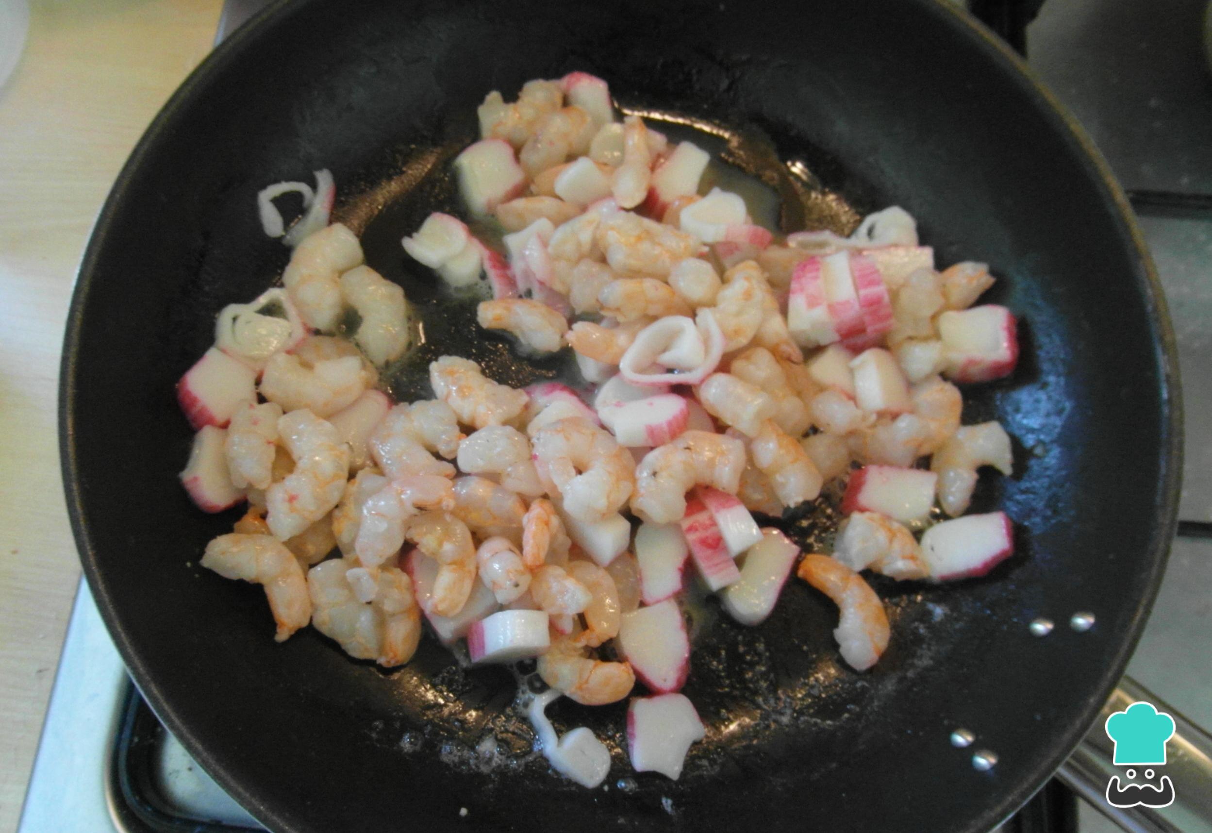 Adicione o kani e cozinhe até começar desfazendo. Desligue o fogo, adicione o atum, tempere com sal e pimenta e misture. Reserve para esfriar.