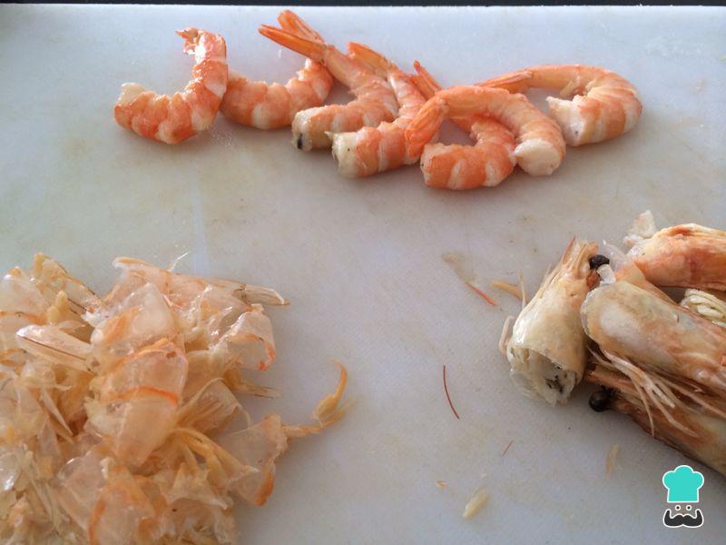 Em seguida descasque os camarões, deixando ficar somente o rabo. Com uma faca afiada, faça um corte na parte de cima dos camarões, para retirar a veia.