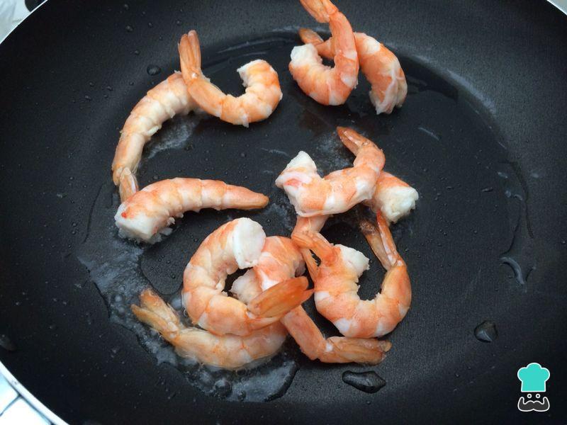 Por último, resta cozinhar o camarão. Para isso leve ao fogo alto uma frigideira com um pouco de óleo e o alho picado, e salteie os camarões por 2-3 minutos. Tempere com sal e pimenta a gosto.