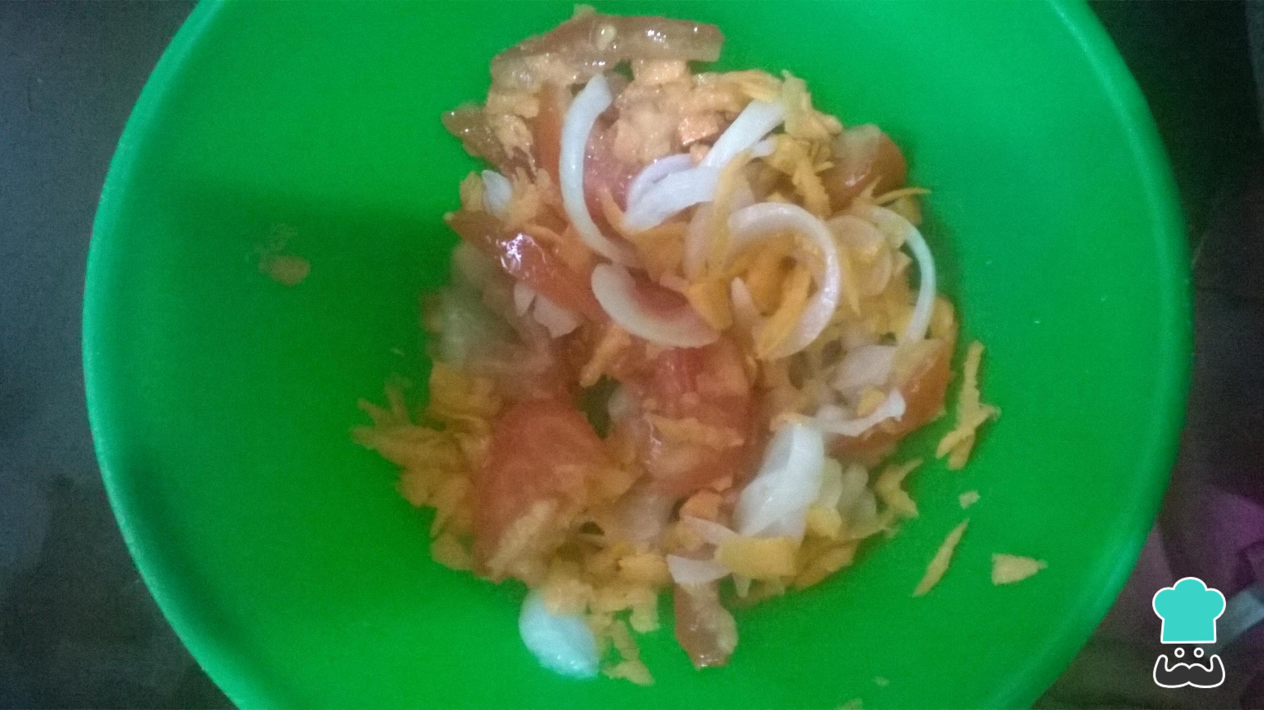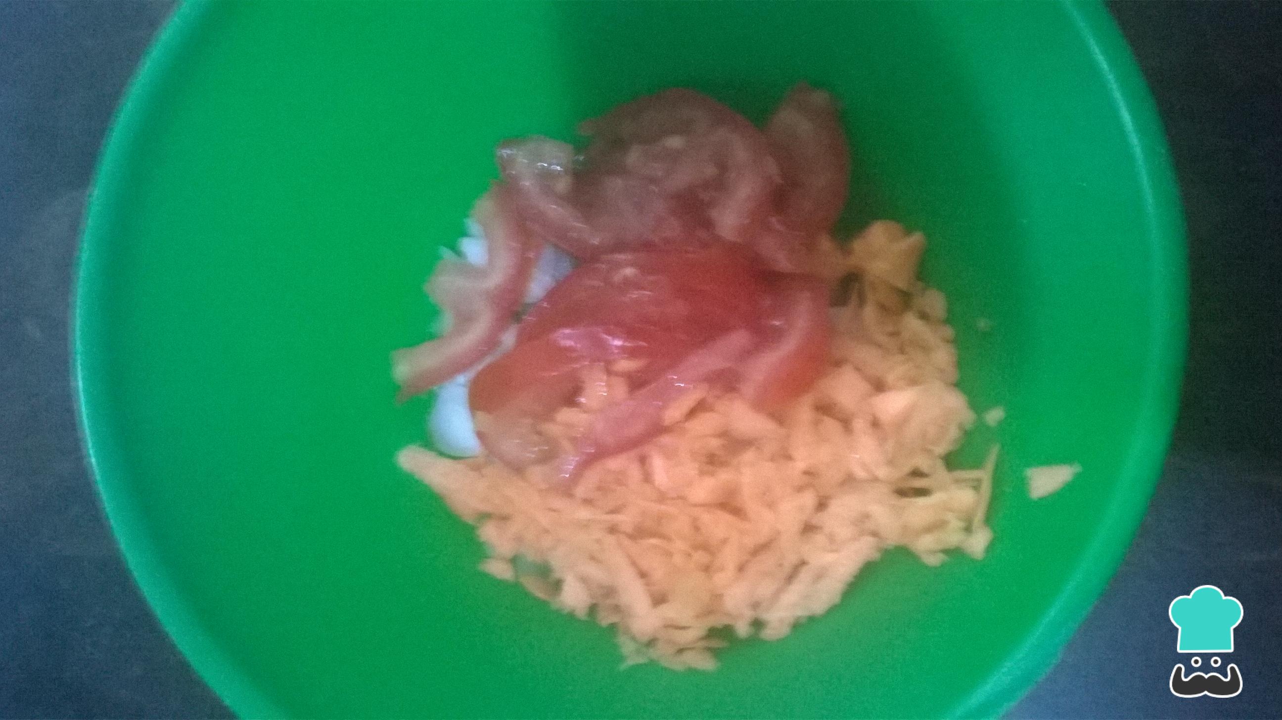Coloque a cebola, cenoura e tomate em uma tigela ou saladeira. Misture para que os sabores fiquem bem distribuídos.