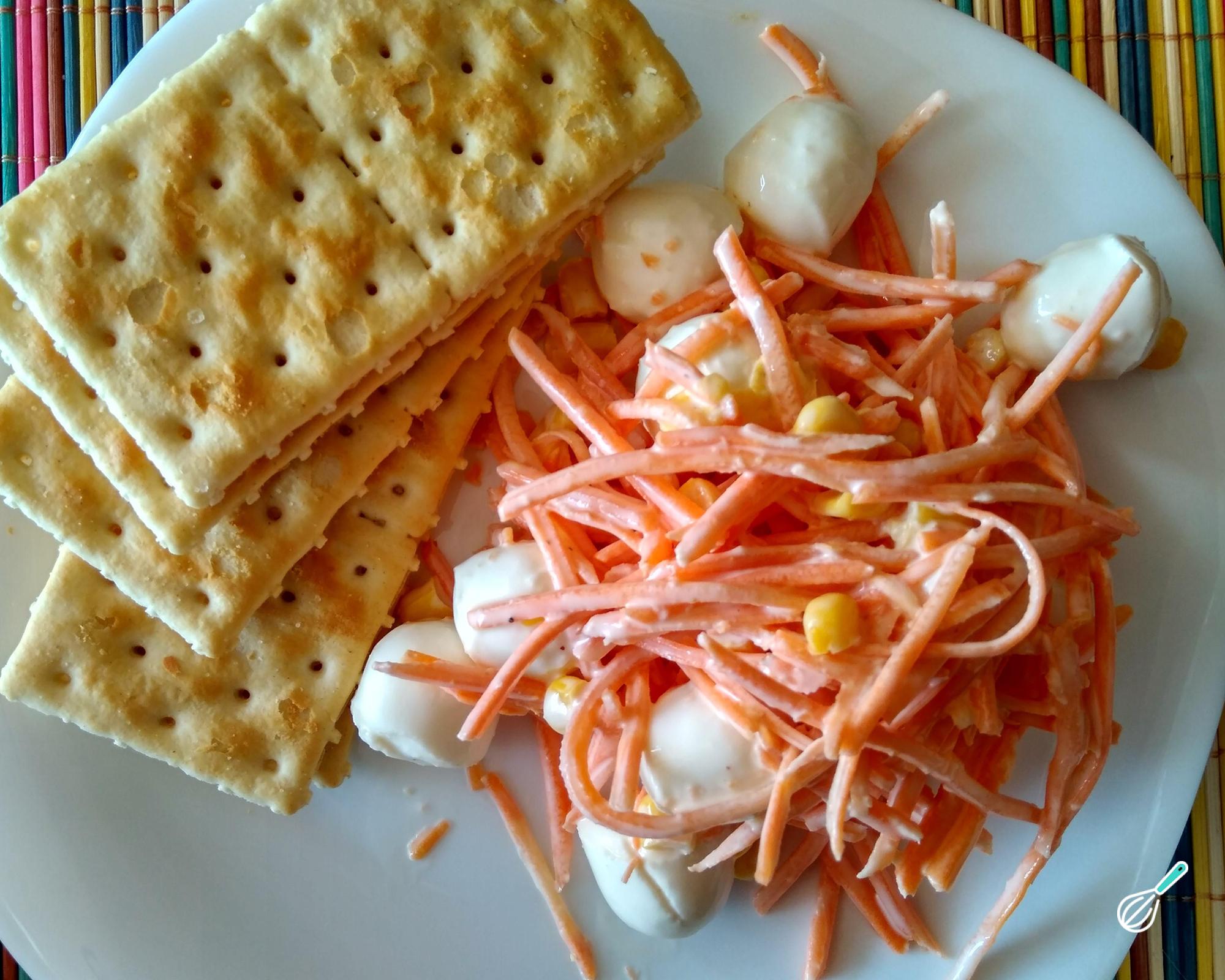 E está pronta sua salada de cenoura com milho, maionese e mussarela! Deixe na geladeira até ao momento de servir e sirva como acompanhamento das suas refeições, entrada ou para completar um sanduíche. Bom apetite!
