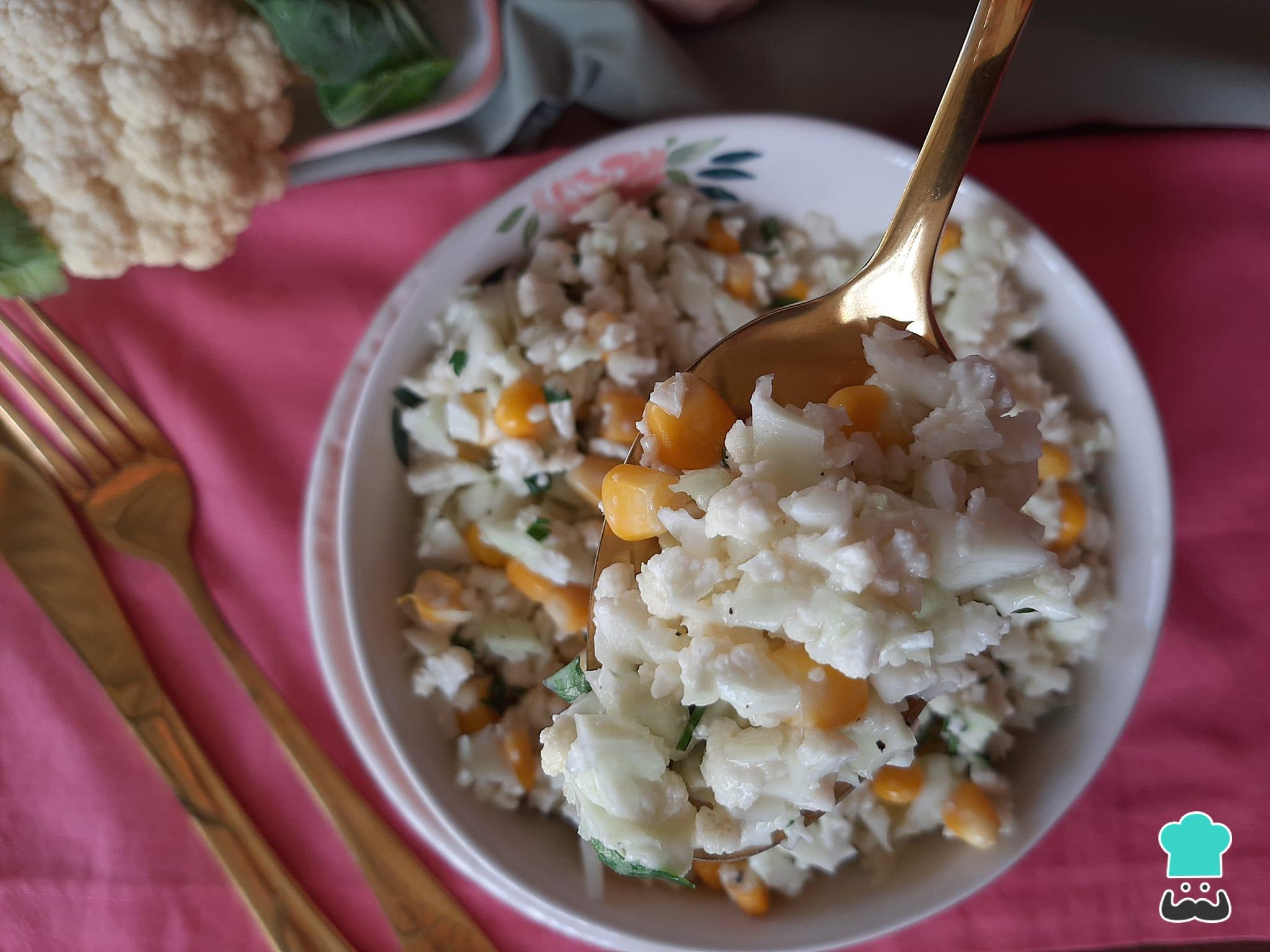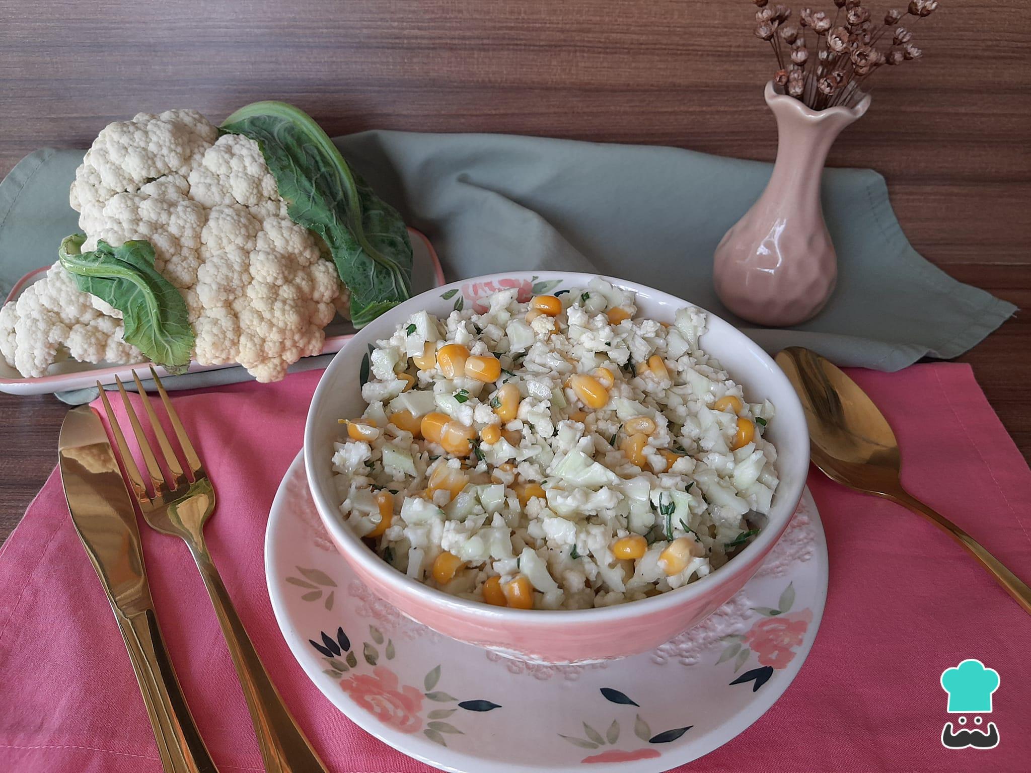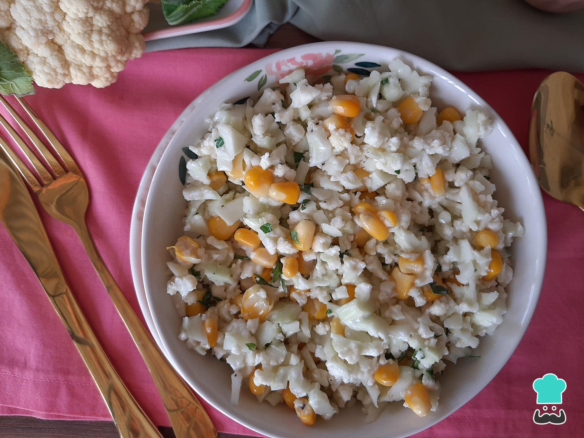 Num bowl ou tigela, junte a couve-flor picada e o milho verde (escorrido) e regue com o molho preparado anteriormente.