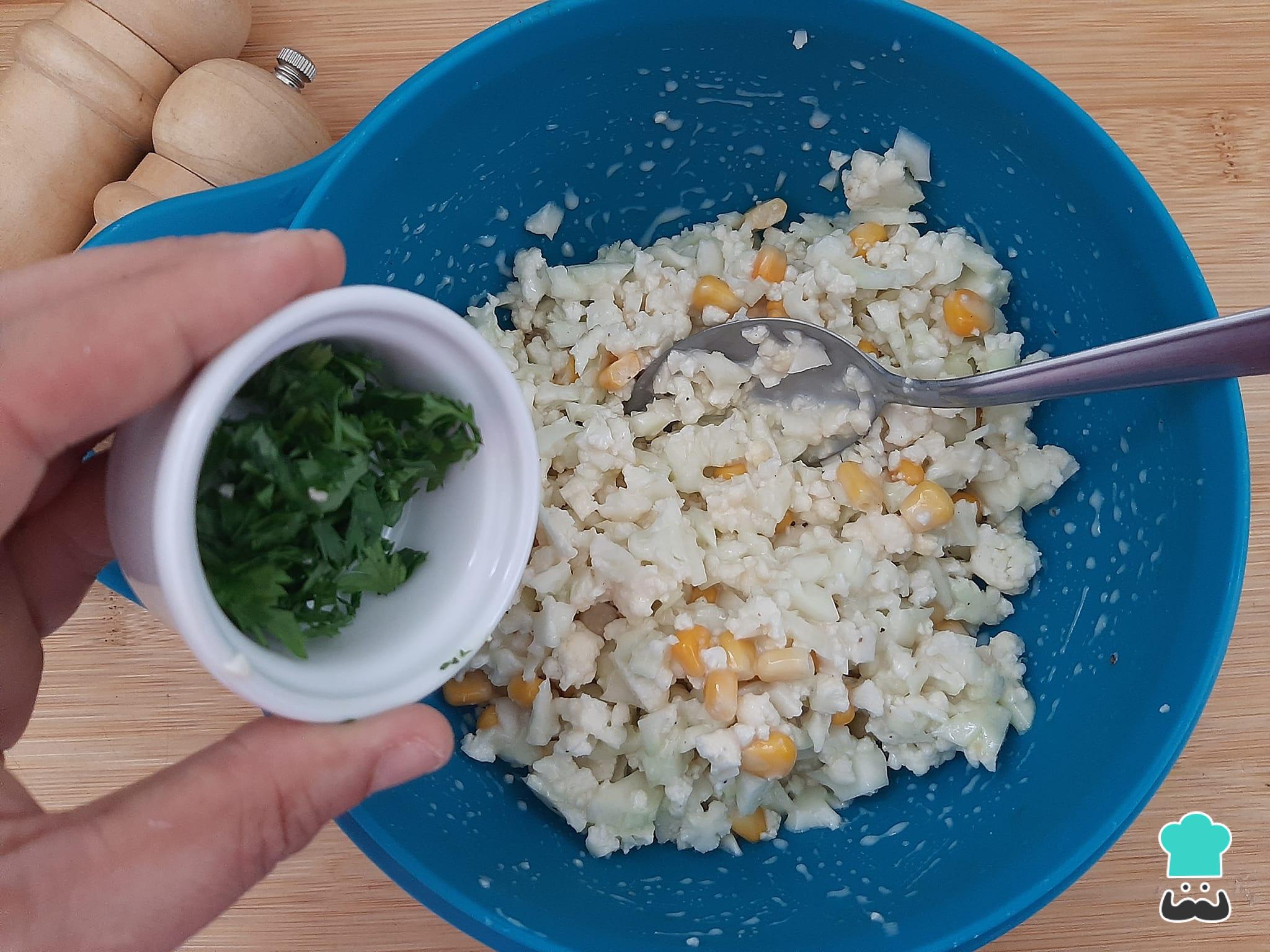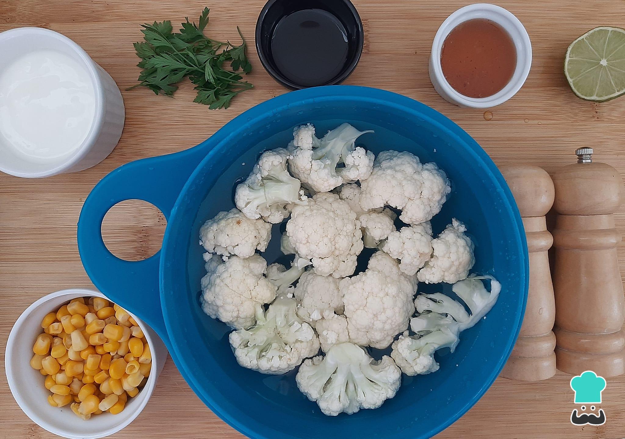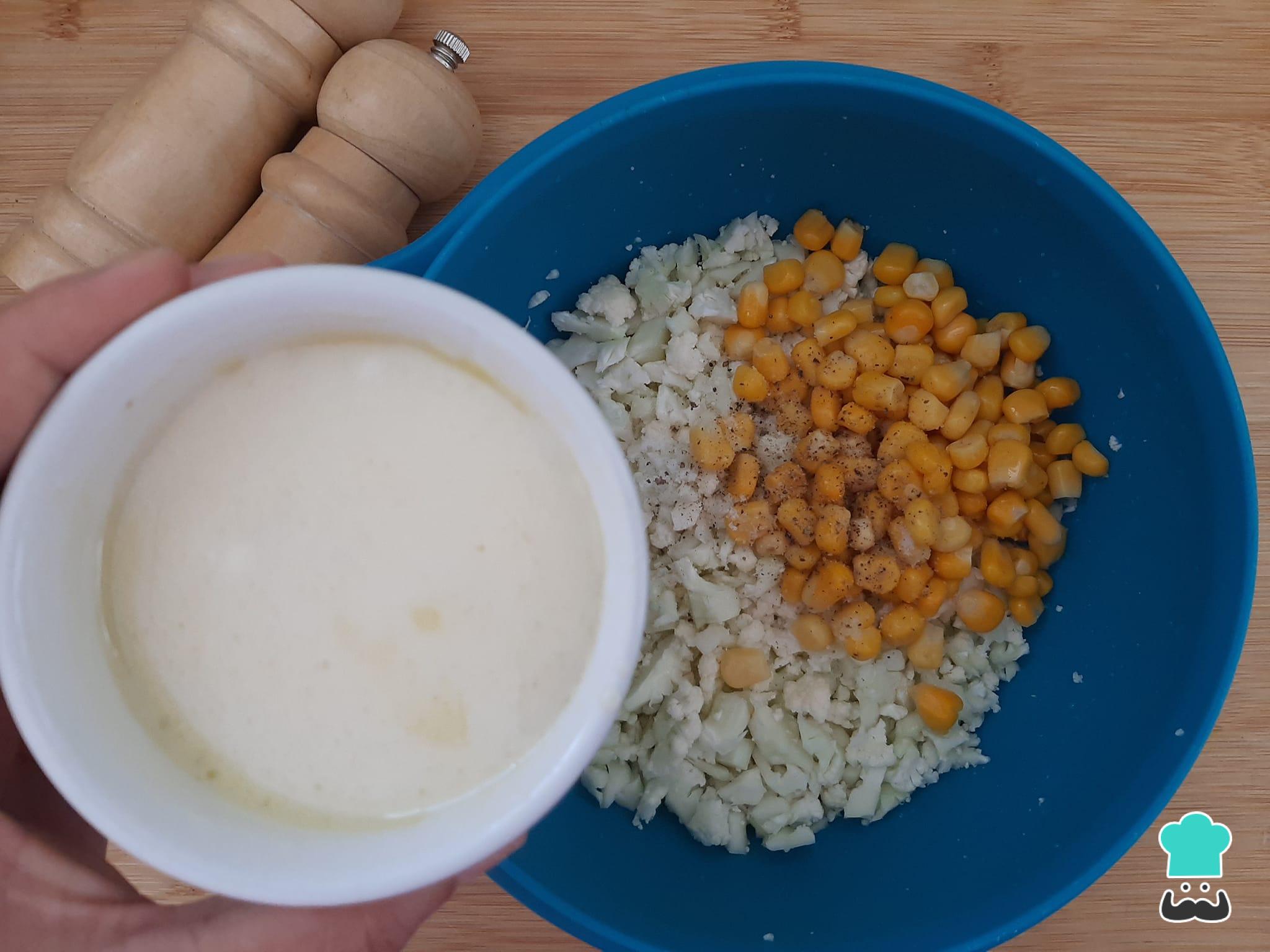 Num bowl ou tigela, junte a couve-flor picada e o milho verde (escorrido) e regue com o molho preparado anteriormente.