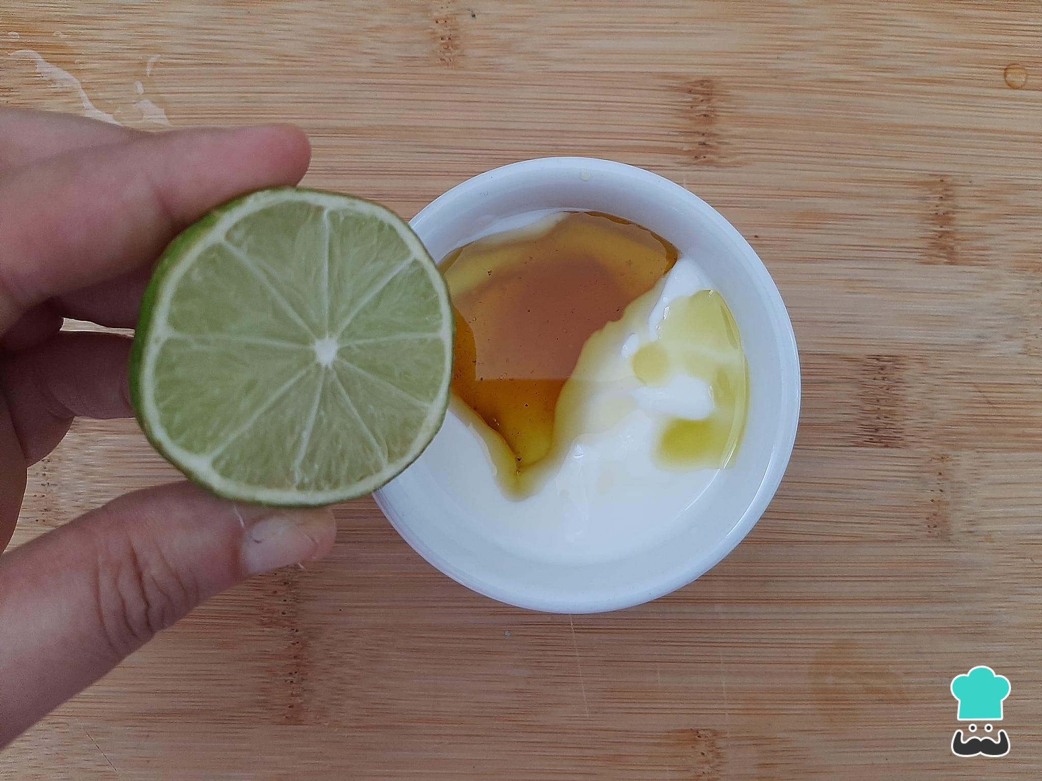 Num recipiente, junte os ingredientes do molho que irá regar a salada: iogurte, mel, azeite de oliva e gotinhas de limão.