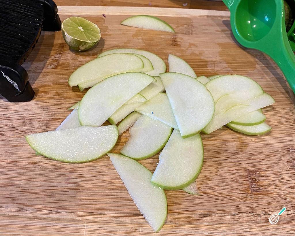 Comece tirando a semente da maçã verde e cortando-a em fatias bem fininhas. Regue com o suco de limão, para evitar que ela oxide.