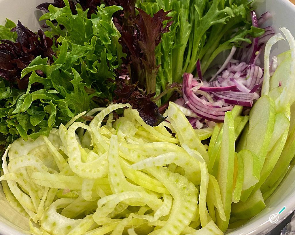 Agora chegou a parte de picar o resto dos ingredientes. Pique a erva doce e a cebola roxa em fatias bem fininhas - eu uso um mandolim para isso, mas com uma faca bem afiada você consegue também. Agora junte tudo isso que você picou com a maçã verde e as folhas.
