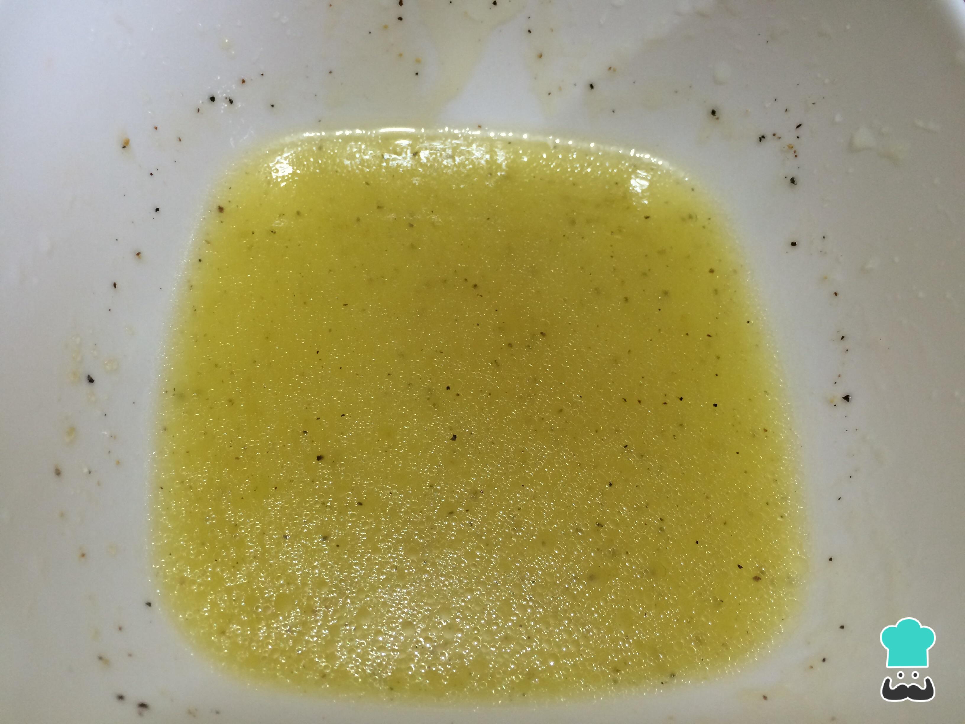 Para temperar, em uma tigela misture o suco de limão, o azeite, sal e pimenta. Se preferir um vinagrete mais elaborado, confira a a receita de vinagrete de mel e mostarda.