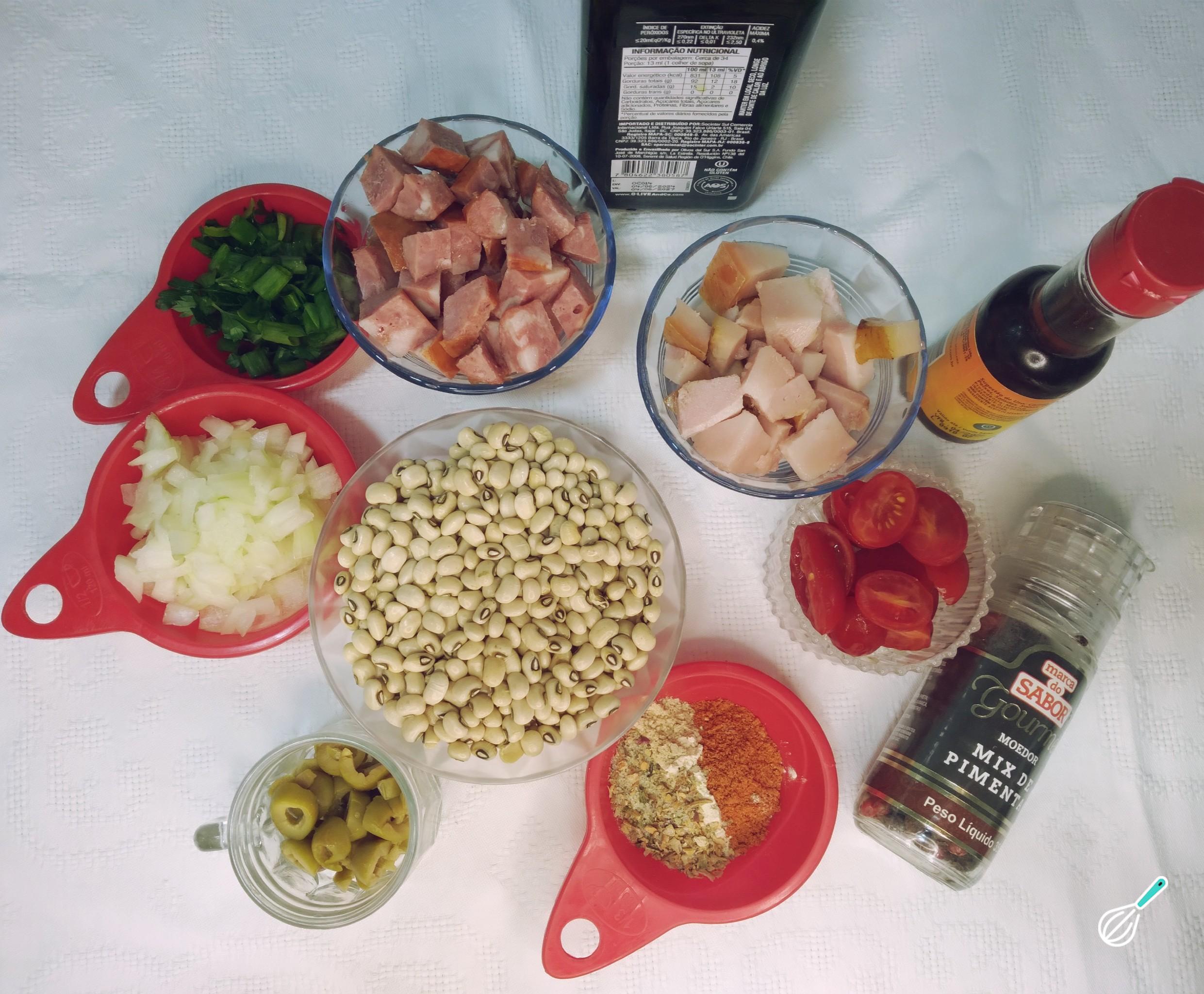 Comece separando os ingredientes para o preparo da salada de feijão fradinho com calabresa.