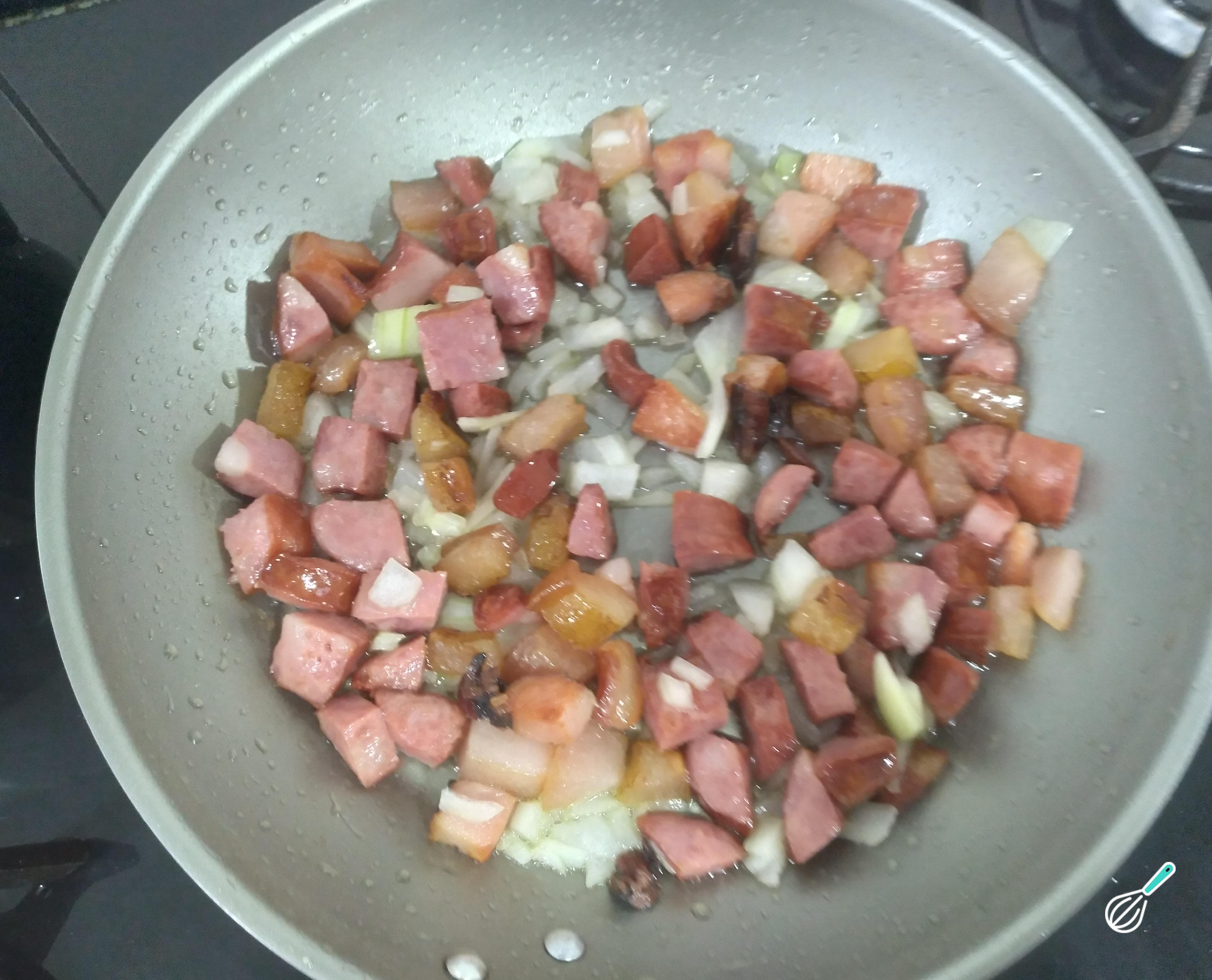 Depois de fritar um pouco o bacon, acrescente a linguiça calabresa e cebola branca picada.