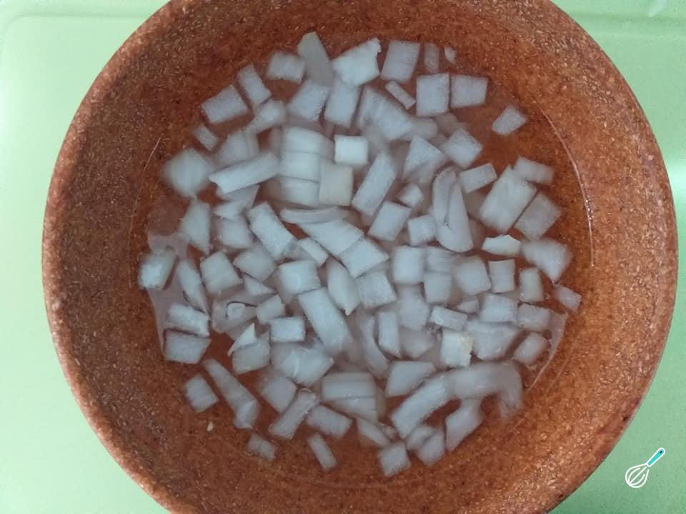 Dica: Essa dica da cebola é muito valiosa para quem quer incluir cebola crua nas receitas, pois esse tempo de molho na água gelada faz com que reduza acidez da cebola!