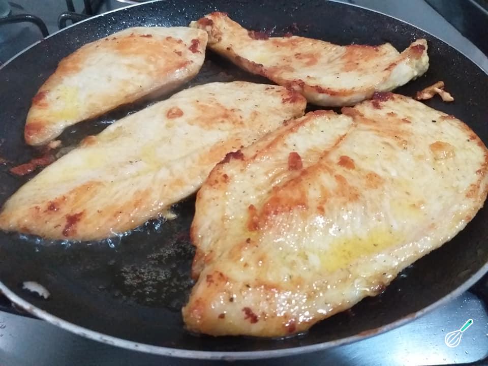 Tempere os filés de frango com alho, sal, pimenta do reino e molho inglês. Aqueça uma frigideira e acrescente o azeite de oliva. Em seguida, derreta a manteiga e frite os filés de frango até ficarem dourados.