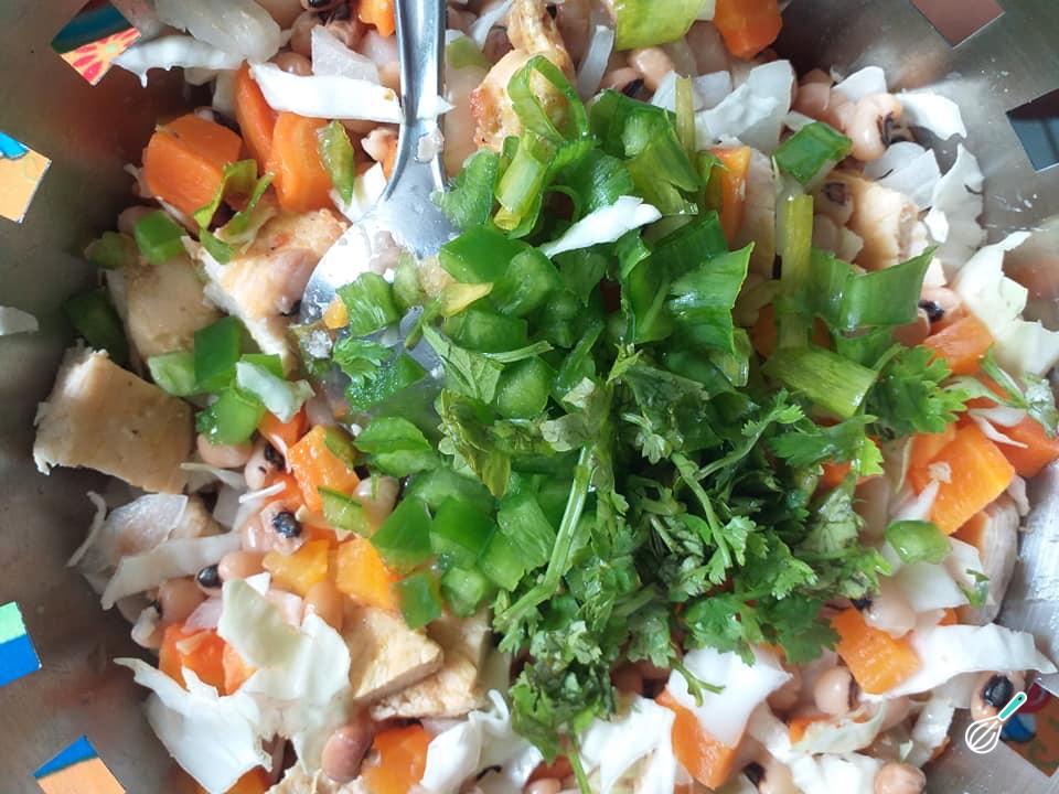 Numa tigela média (pode ser na própria tigela onde você irá servir a salada), misture delicadamente o feijão cozido e escorrido, o peito de frango frito em cubinhos ou desfiado, o repolho cru cortado em tiras, a cenoura cozida em cubinhos, o pimentão picado e, por último, o cheiro verde.