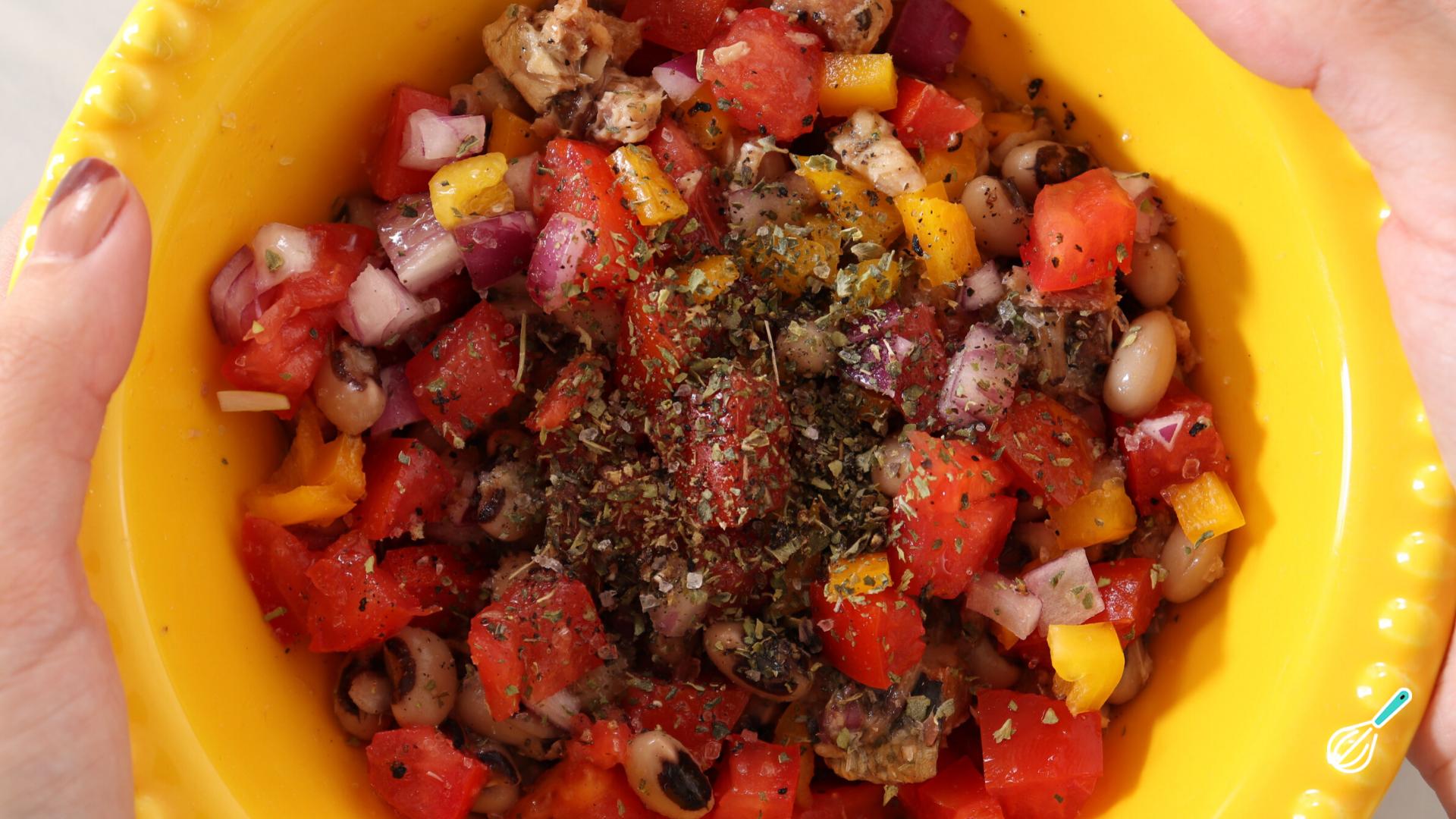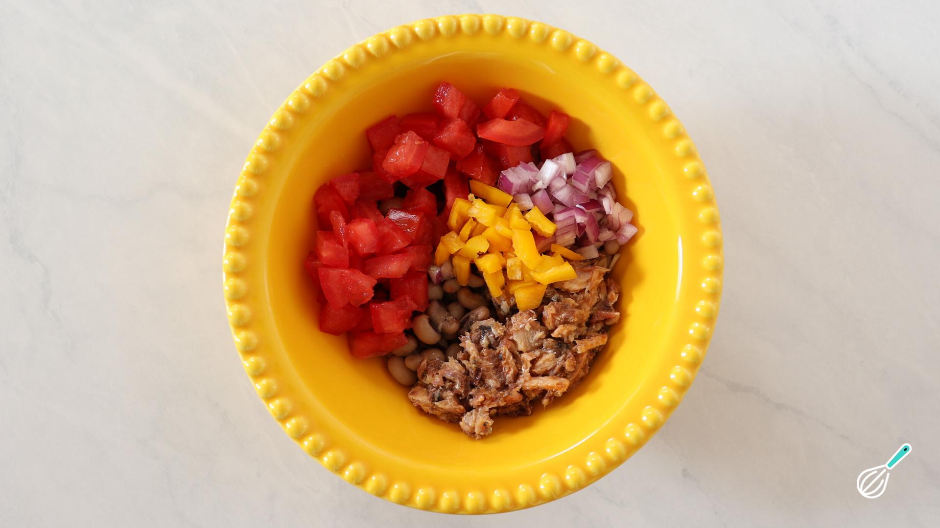 Em seguida é só colocar todos os ingredientes em uma tigela - a dica aqui é misturar delicadamente, para o feijão permanecer inteiro e ficar mais bonito visualmente na hora de servir.
