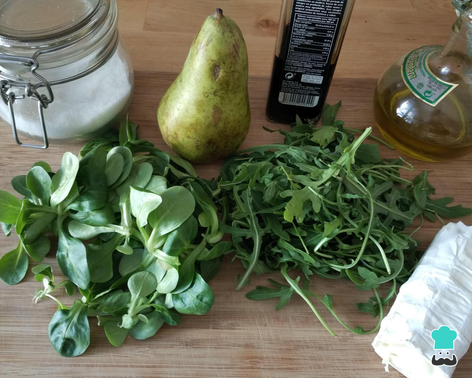Reúna todos os ingredientes para fazer esta receita de salada de folhas verdes com fruta (pera). Neste caso as folhas verdes para salada escolhidas foram alface de cordeiro e rúcula, mas você também pode usar alface comum e espinafre.