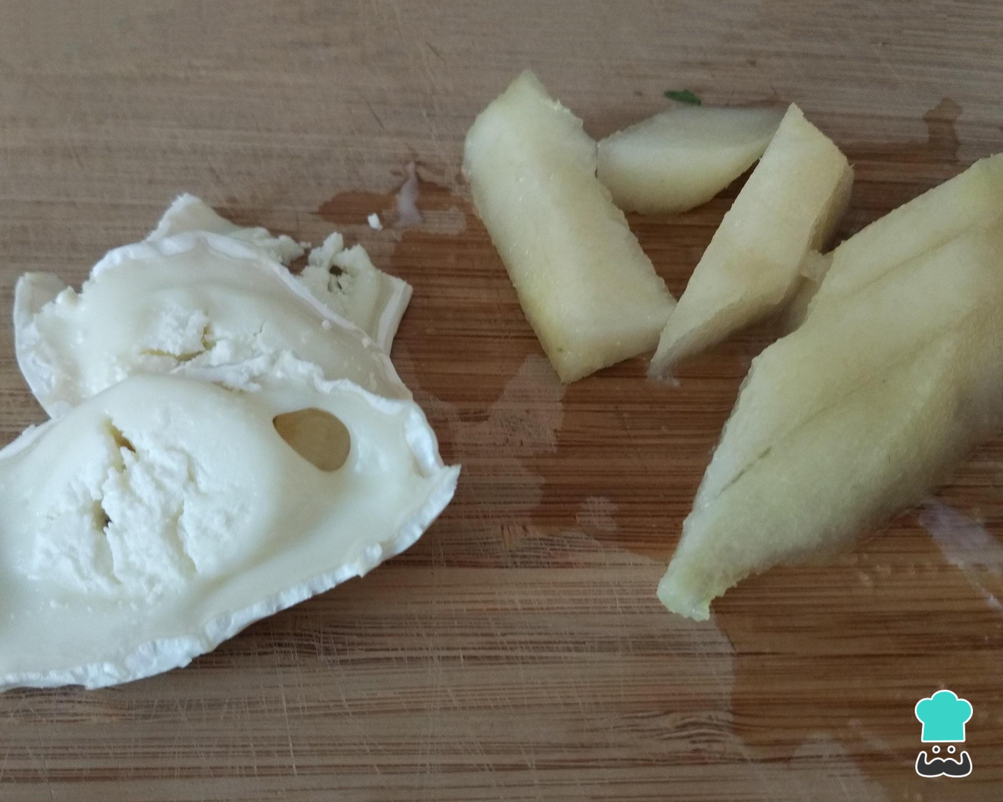 Descasque a pera e corte em pedaços com mais ou menos o mesmo tamanho. Corte também o queijo em rodelas.