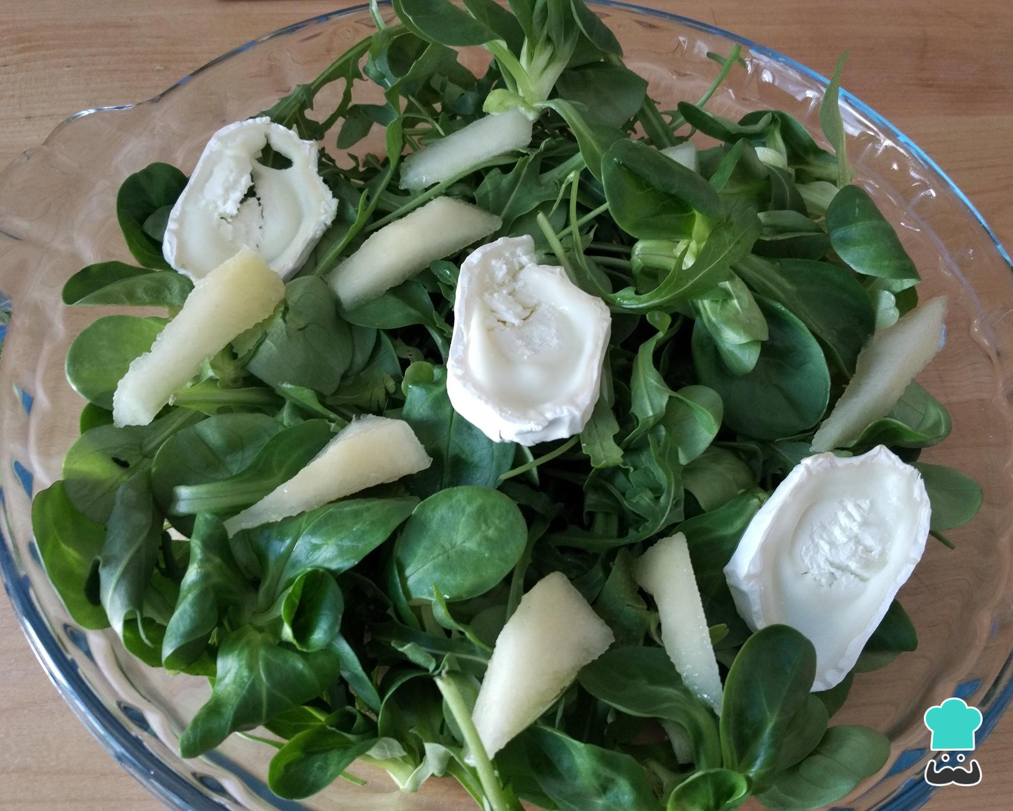 Coloque a pera e o queijo por cima do mix de folhas verdes para salada crua preparado no passo 2, tal como na imagem.