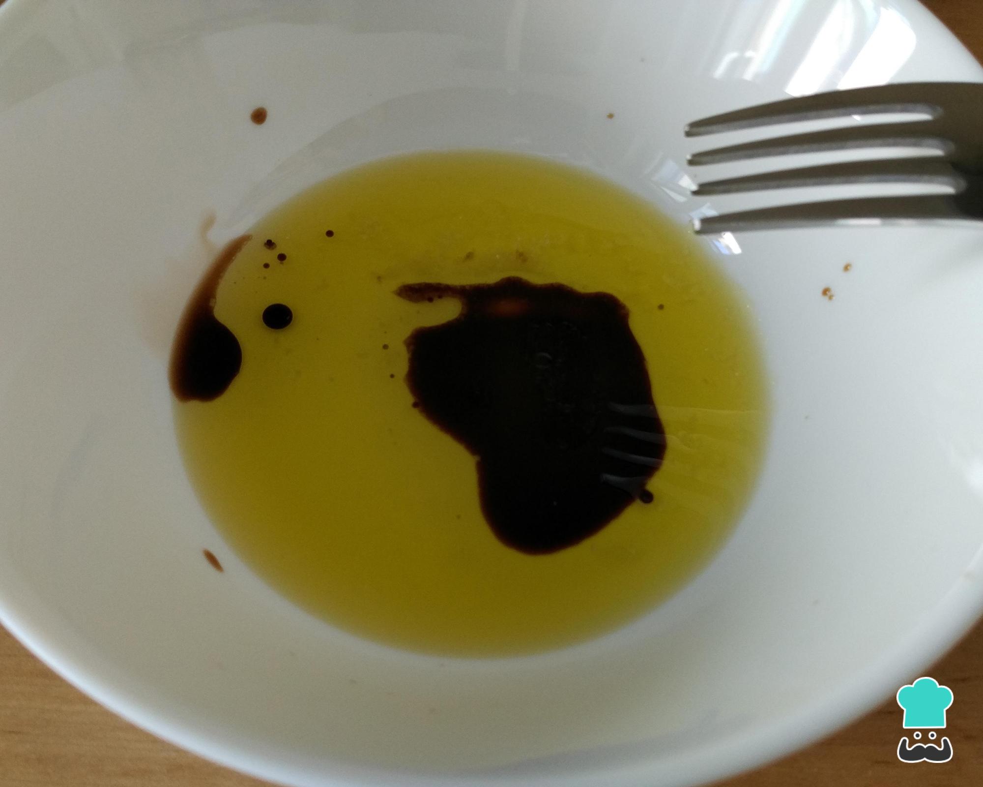 Para fazer o molho para salada de folhas verdes misture num recipiente 3 colheres de sopa de azeite de oliva e 2 colheres de chá de vinagre balsâmico. Para equilibrar os sabores coloque também uma pitada e sal e uma pitada de açúcar e misture tudo.
