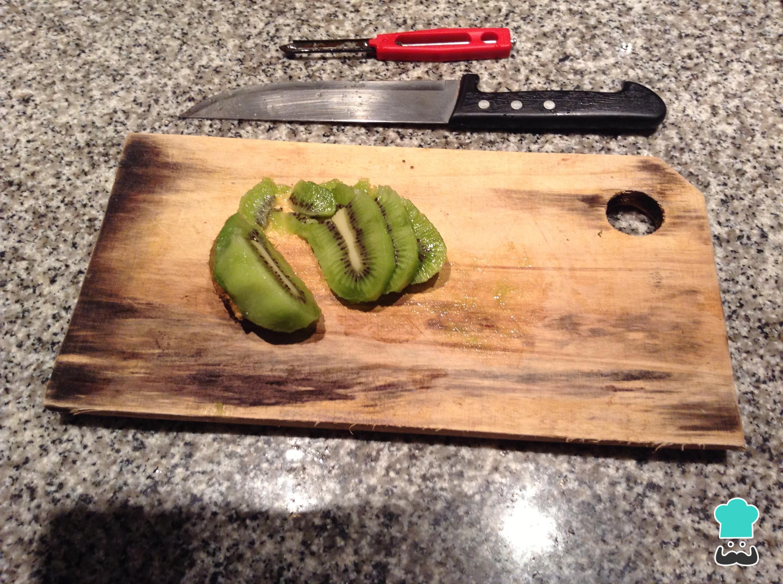 Descasque o kiwi e corte-o da forma que preferir, neste caso cortámos às rodelas.