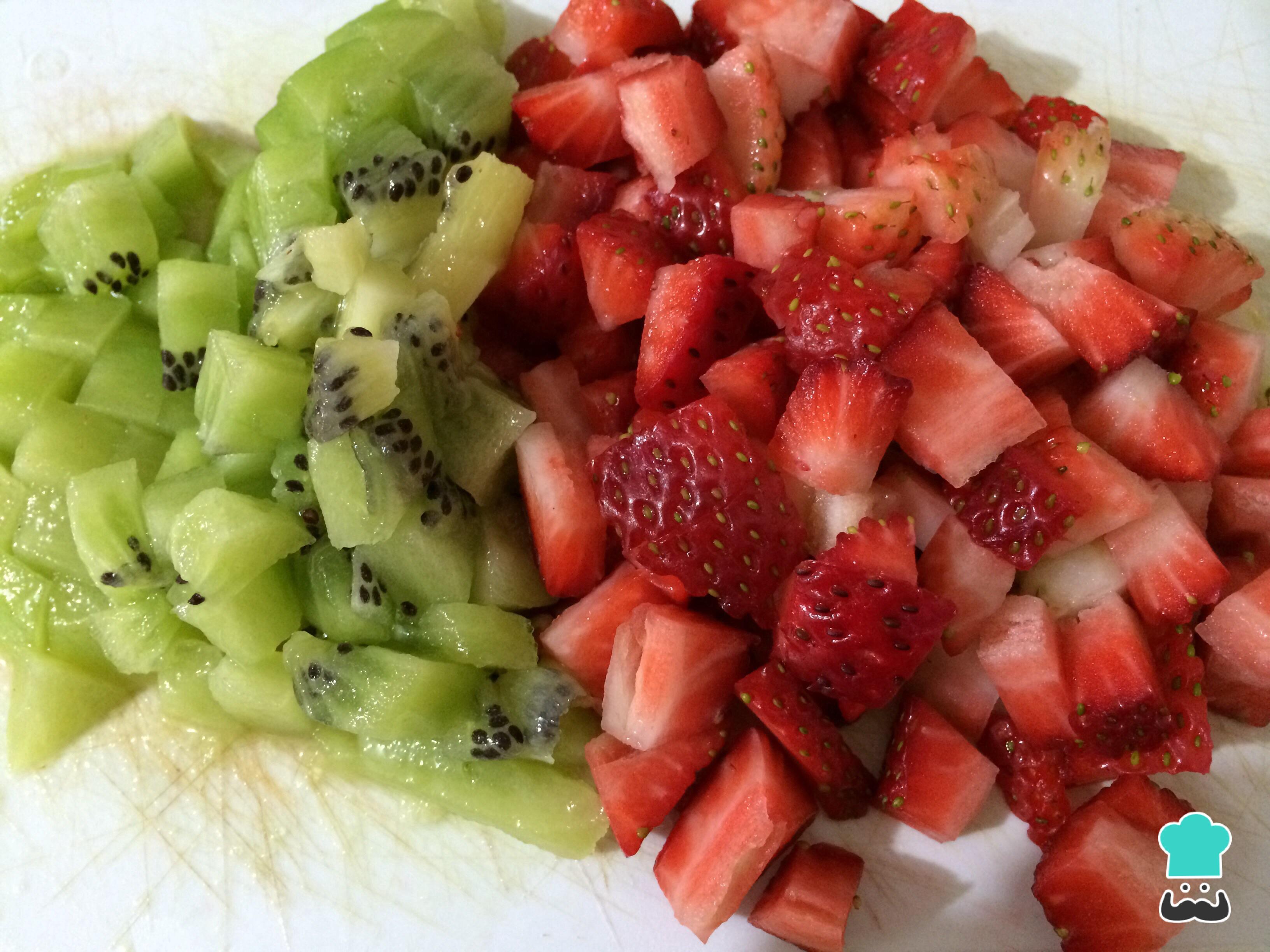 Descasque o kiwi, lave os morangos e corte ambos em pedaços pequenos.