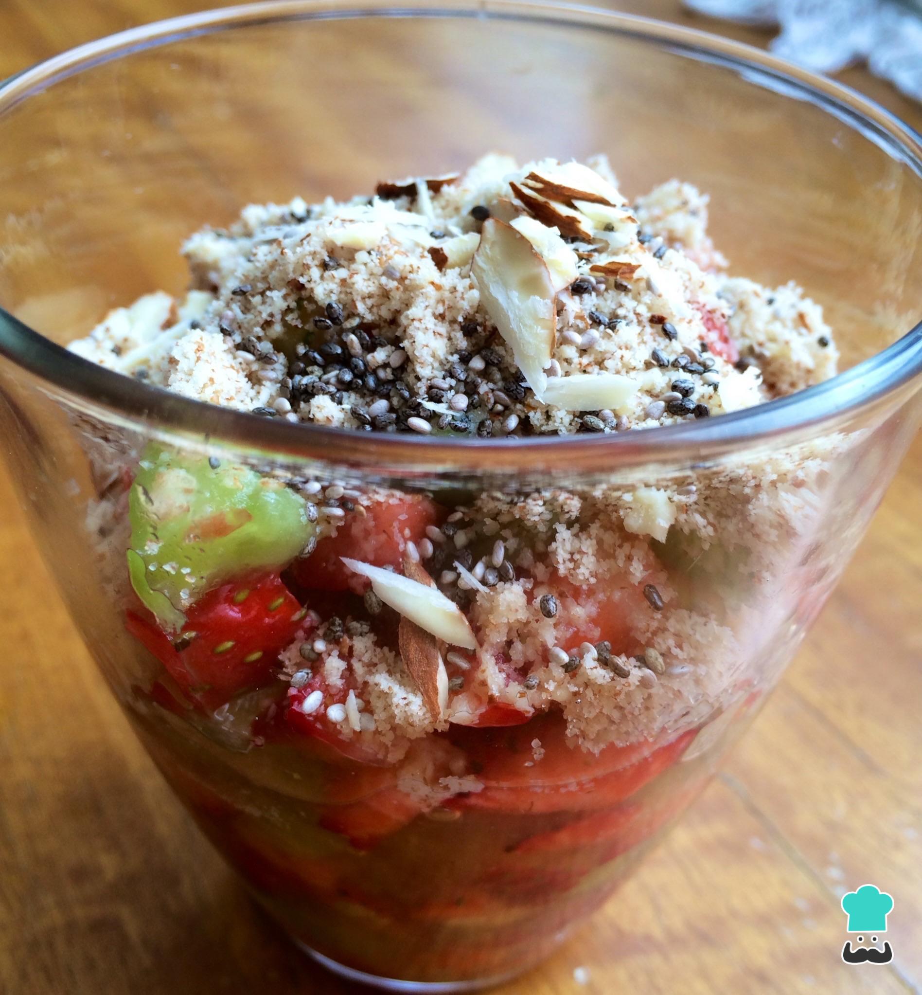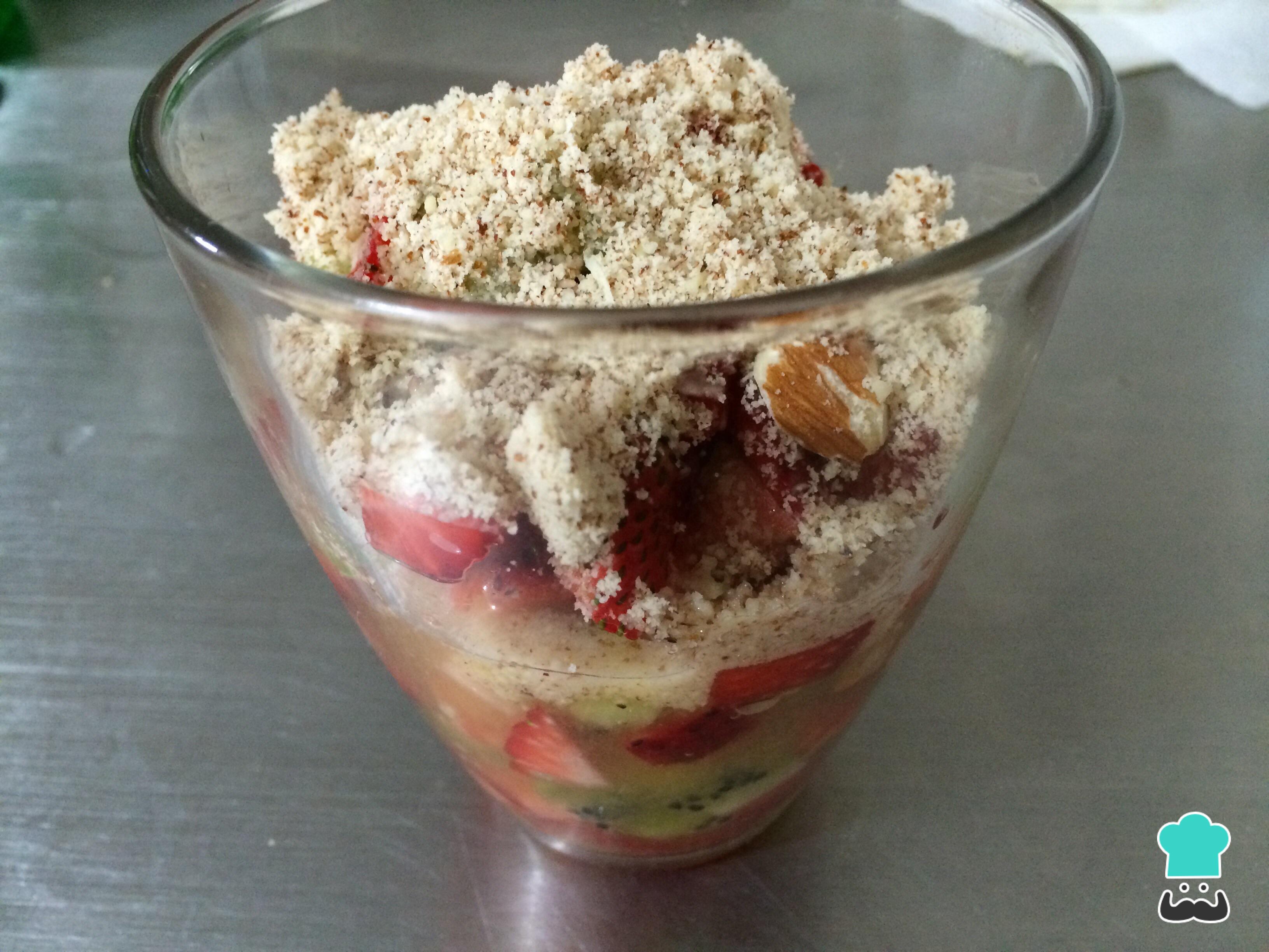 Num copo disponha coloque os morangos e o kiwi picados e acrescente o suco de laranja. Adicione a farinha de frutos secos preparada no passo anterior.