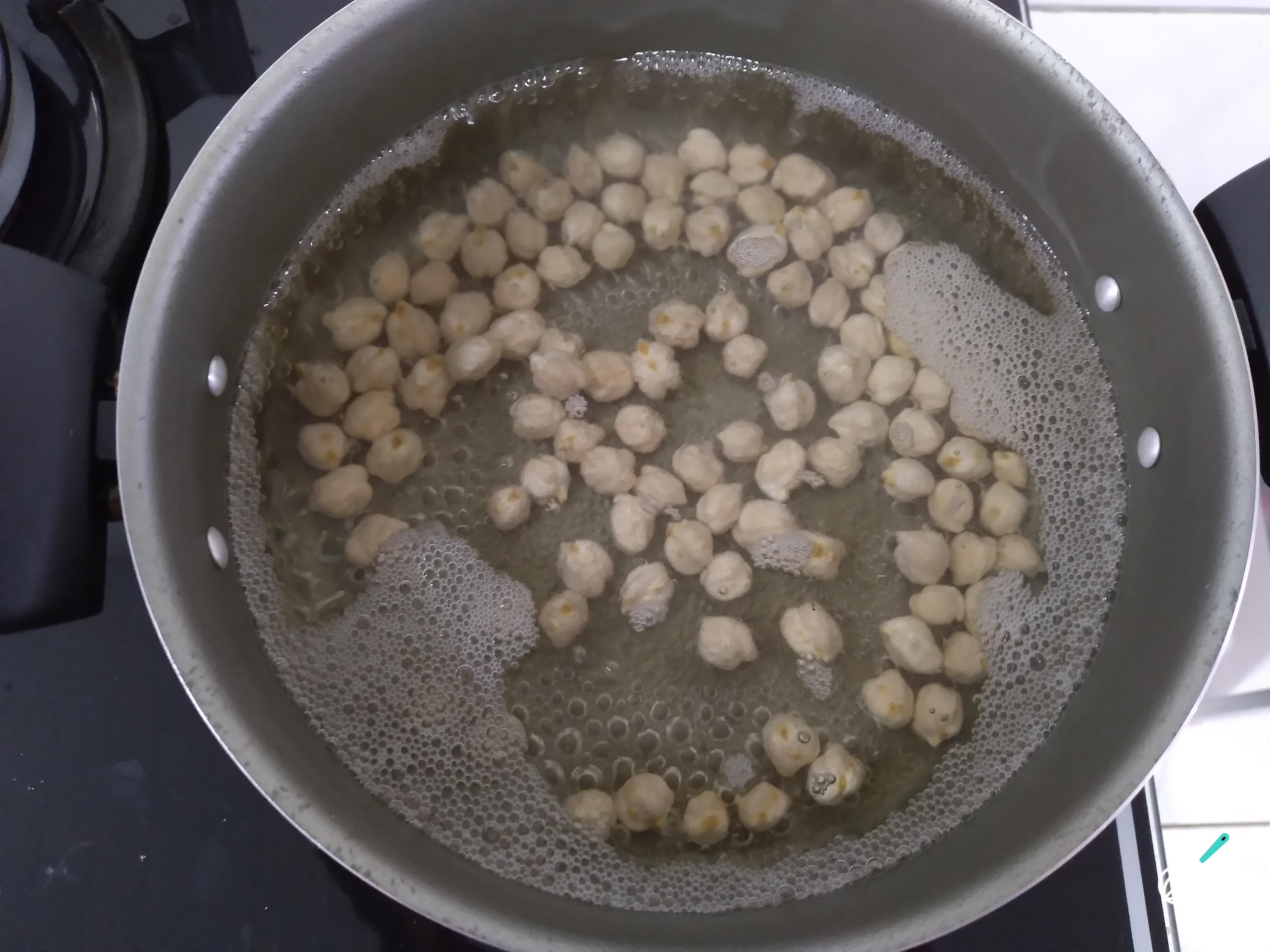 Comece cozinhando o grão-de-bico, cozinhe em uma panela aberta de 15 a 20 minutos. Depois desse tempo, escorra em uma peneira e reserve. Se preferir pode utilizar o grão-de-bico pronto, que já vem cozido.