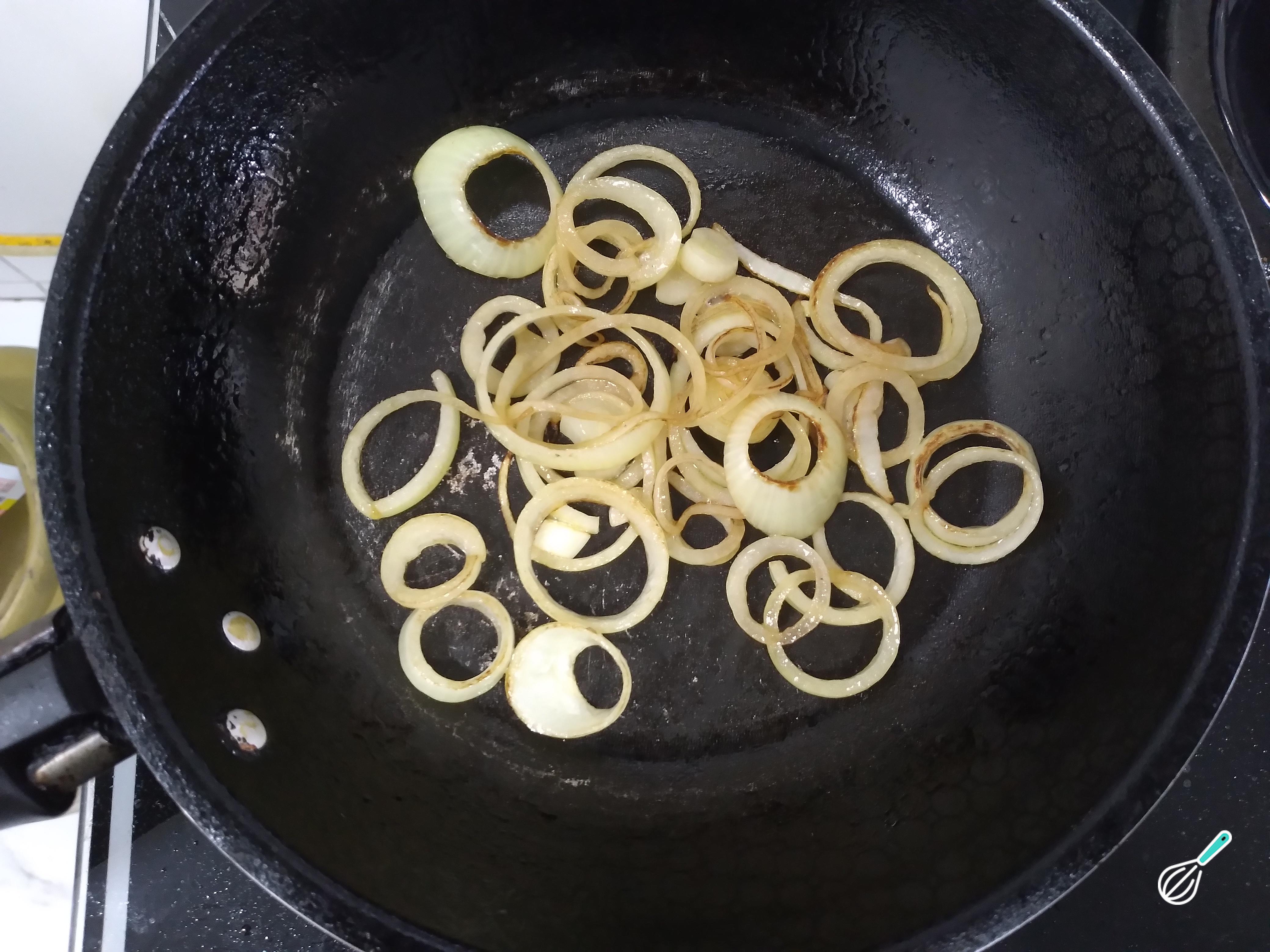 Corte a cebola branca em rodelas, em uma frigideira com um pouco de azeite, coloque-as para dourar. Cuidado para não queimarem. Depois de caramelizadas, reserve.